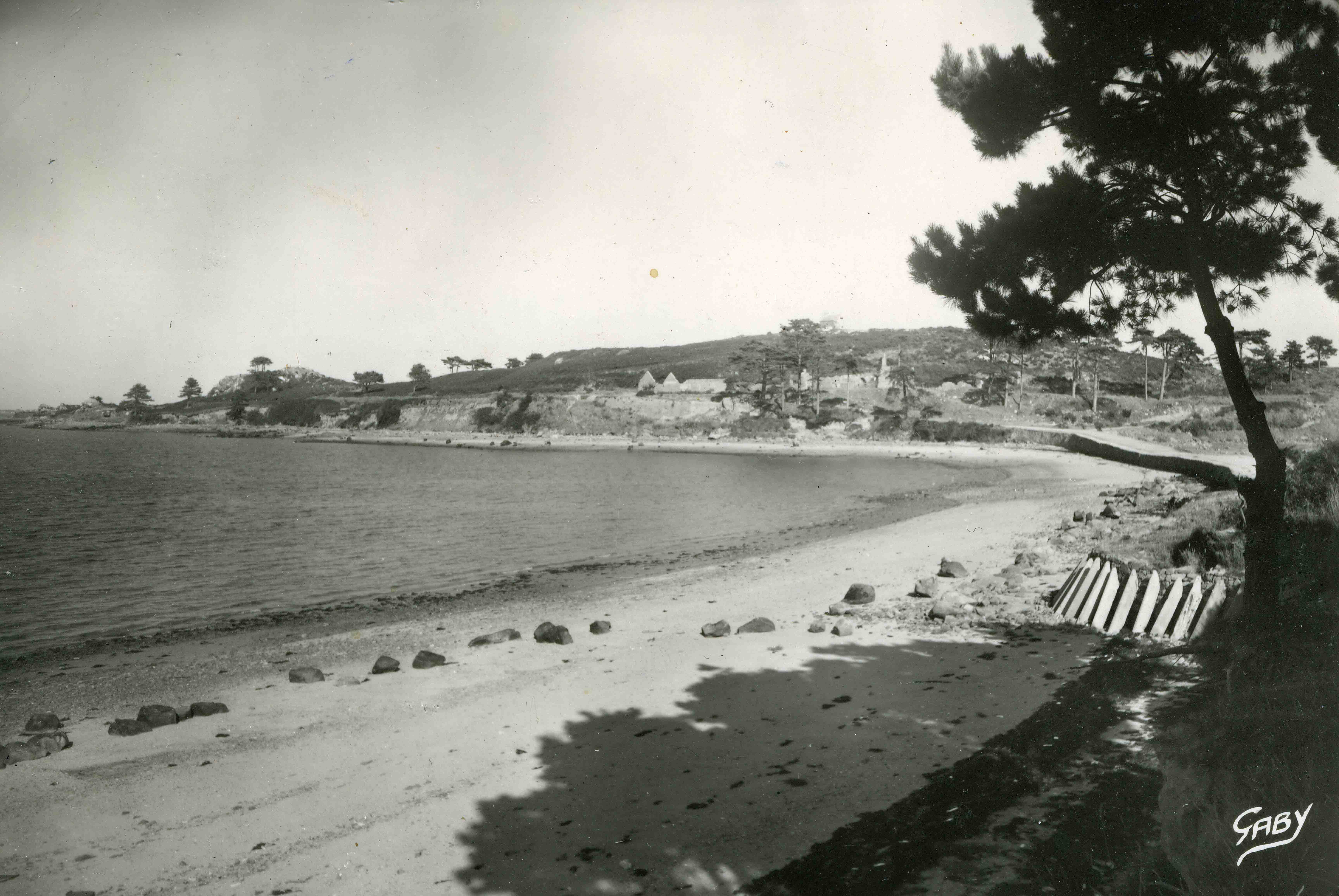 Carte postale de la côte ouest de l’île à Bois, à droite sous le pin ont été déposés des éléments d’obstacles de plage du type tétraèdres en bétonImmatriculation