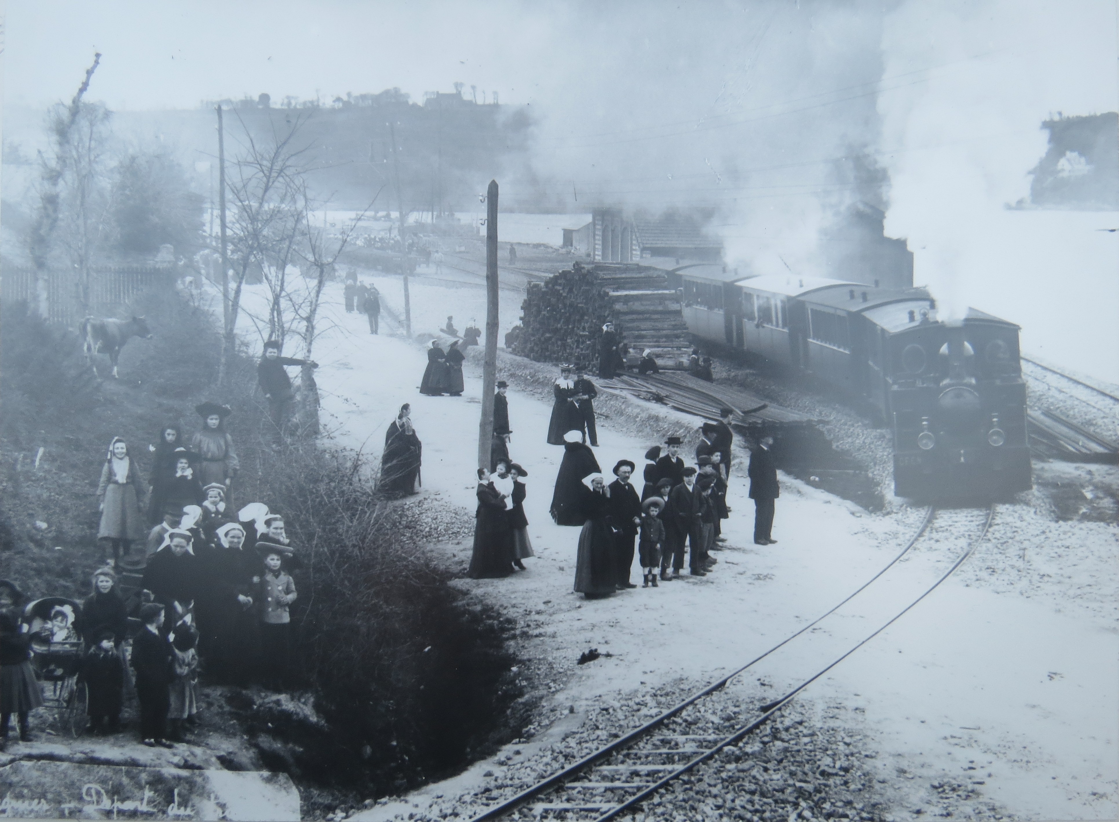 Tréguier, grand nœud ferroviaire, départ du train vers Plouëc un jour de pardon de Saint Yves, une locomotive Blanc–Misseron, trainant 4 voitures de voyageurs s’apprête à franchir le chemin de grande communication de Paimpol, à la sortie du pont Canada (cliché Janvier)Immatriculation