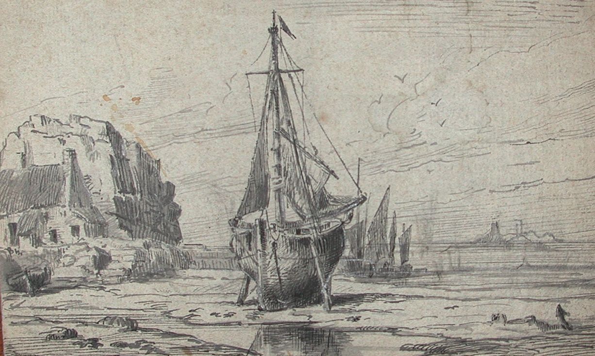 Homardier échoué à Roc’h Hir devant le port de Loguivy de la Mer, dessin FaudacqImmatriculation