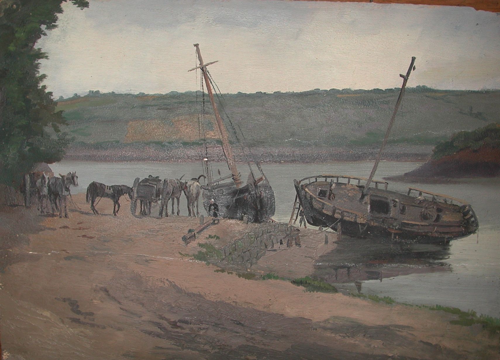 Gabarre à l’échouage avec attelages dans l’anse de Camarel, Faudacq, fin 19ème siècle, dessin aquarelléImmatriculation