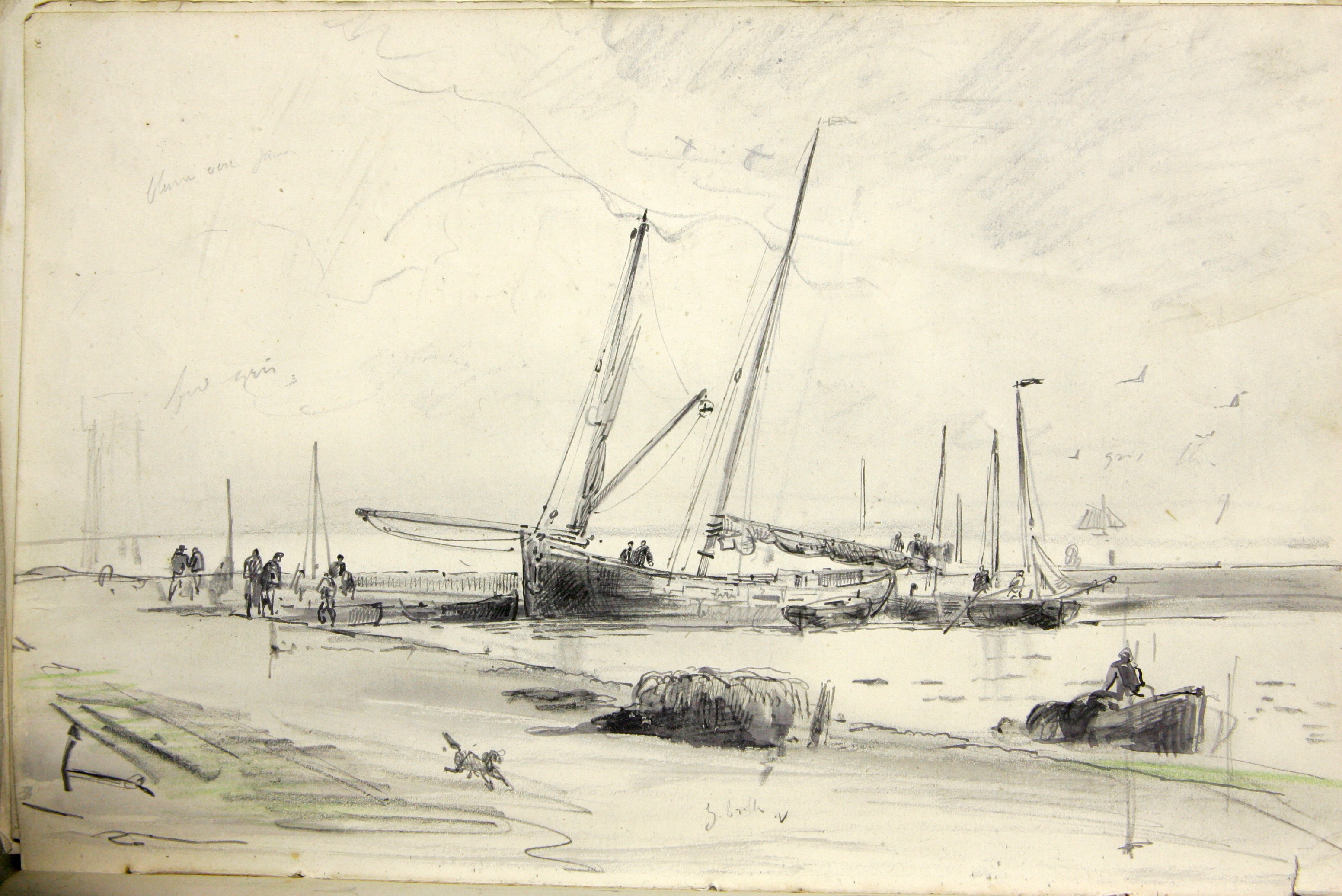 Bateau déchargeant au mât de charge au port de Lézardrieux, Faudacq, fin 19ème siècle, dessin à la plumeImmatriculation