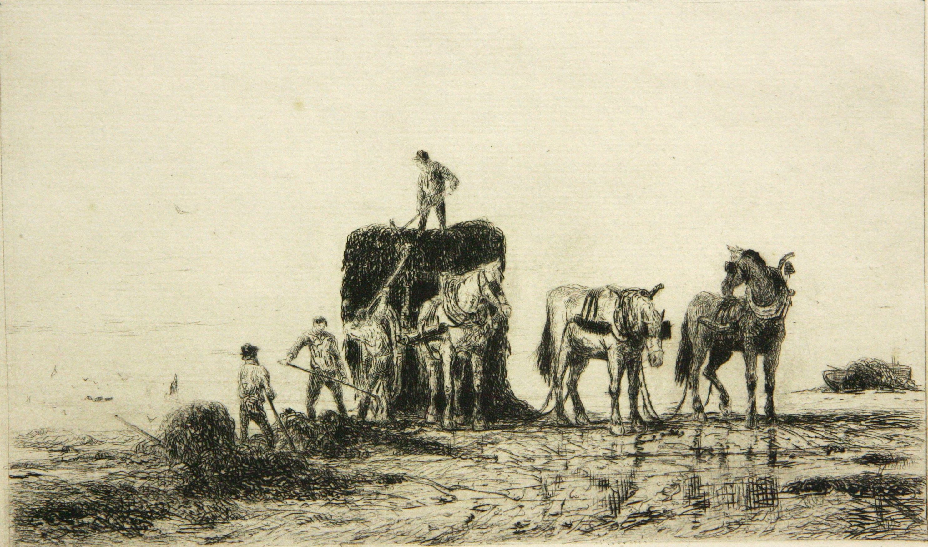 Attelages dans la petite grève pour le transport du goémonier (eau forte, Faudacq)Immatriculation