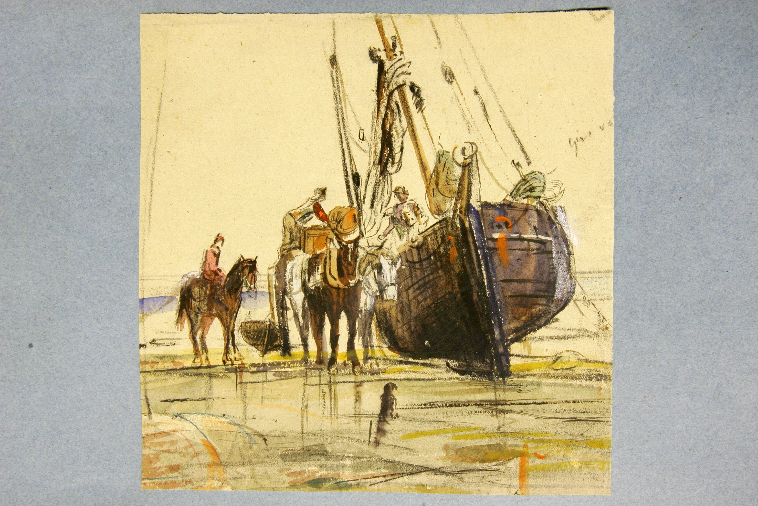 Attelage et bocq à l’échouage (dessin aquarellé, Faudacq)Immatriculation