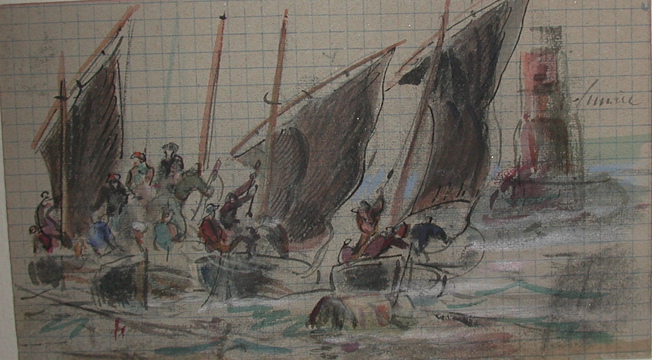 Misainiers en régate à hisser la misaine près d’une balise, dessin aquarellé sur papier quadrillé (Faudacq)Immatriculation