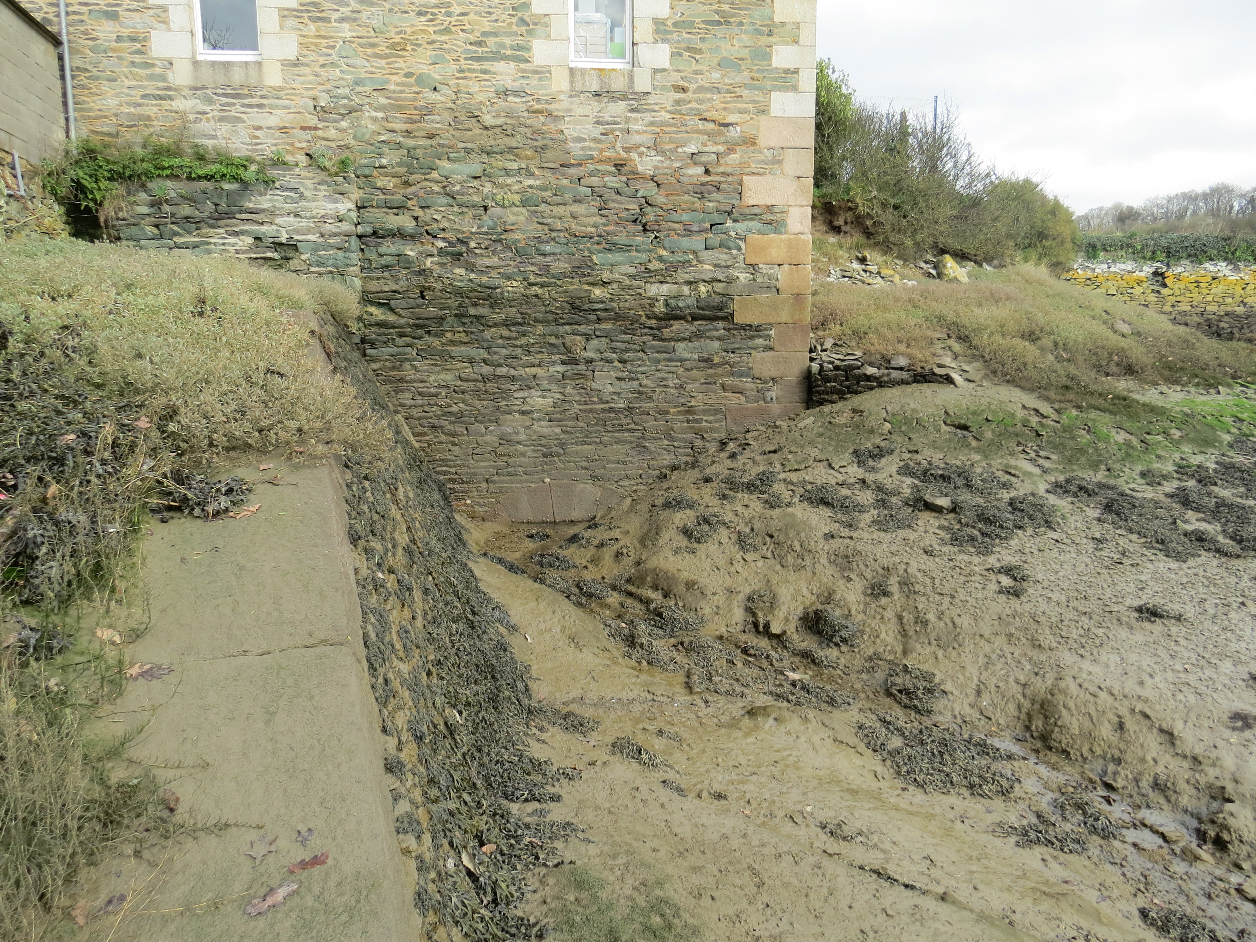 La sortie du canal de fuite, après la roue du moulin. Nous apercevons juste la clef de voute du ponceau... L’effet de chasse de l’eau sortant de la retenue s’est arrêté il y a quelques décennies : la vase s’est accumulée depuisImmatriculation