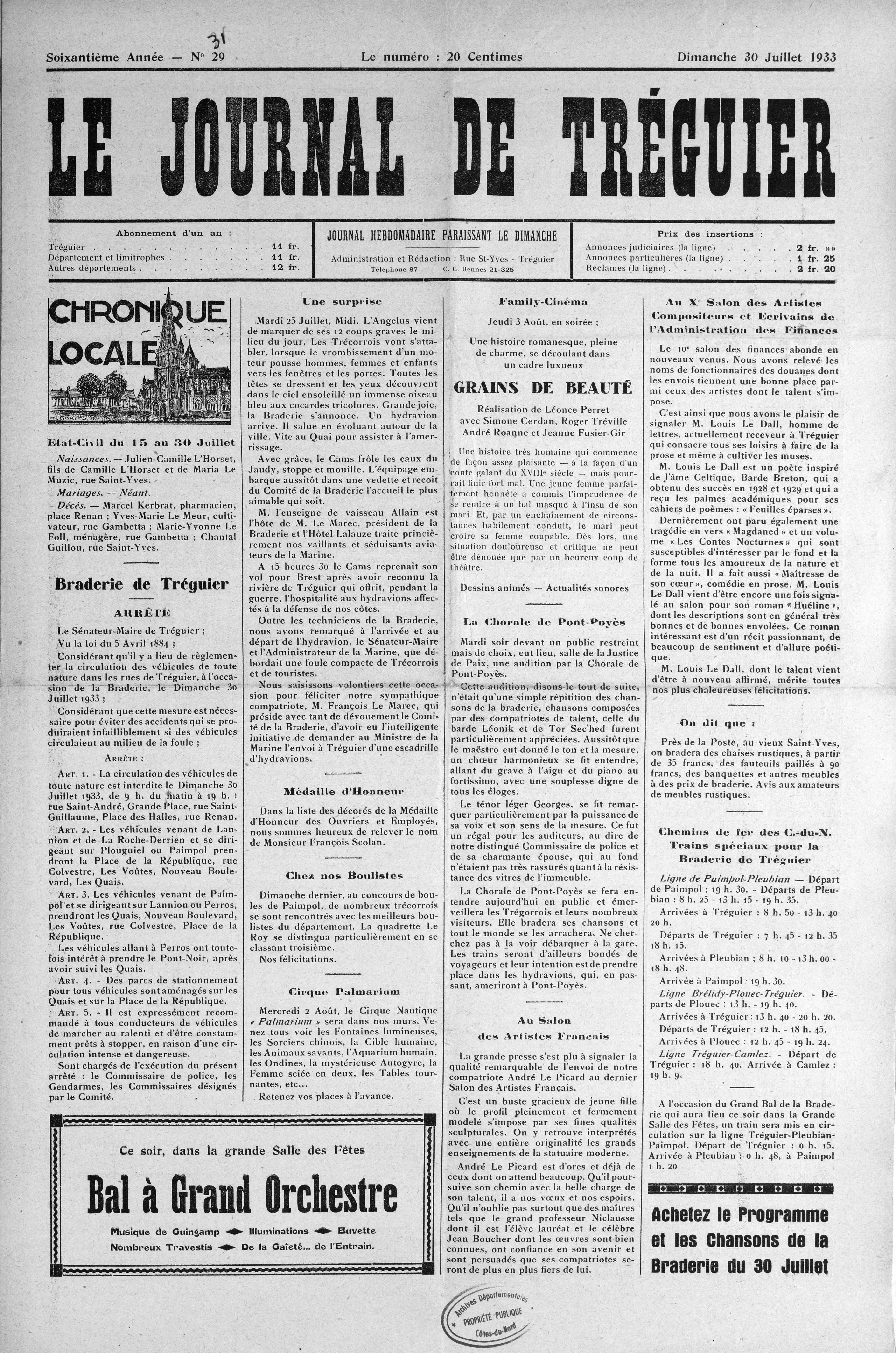 30 juillet 1933, Le journal de Tréguier annonce la braderie (Archives Départementales des Côtes-d’Armor)Immatriculation