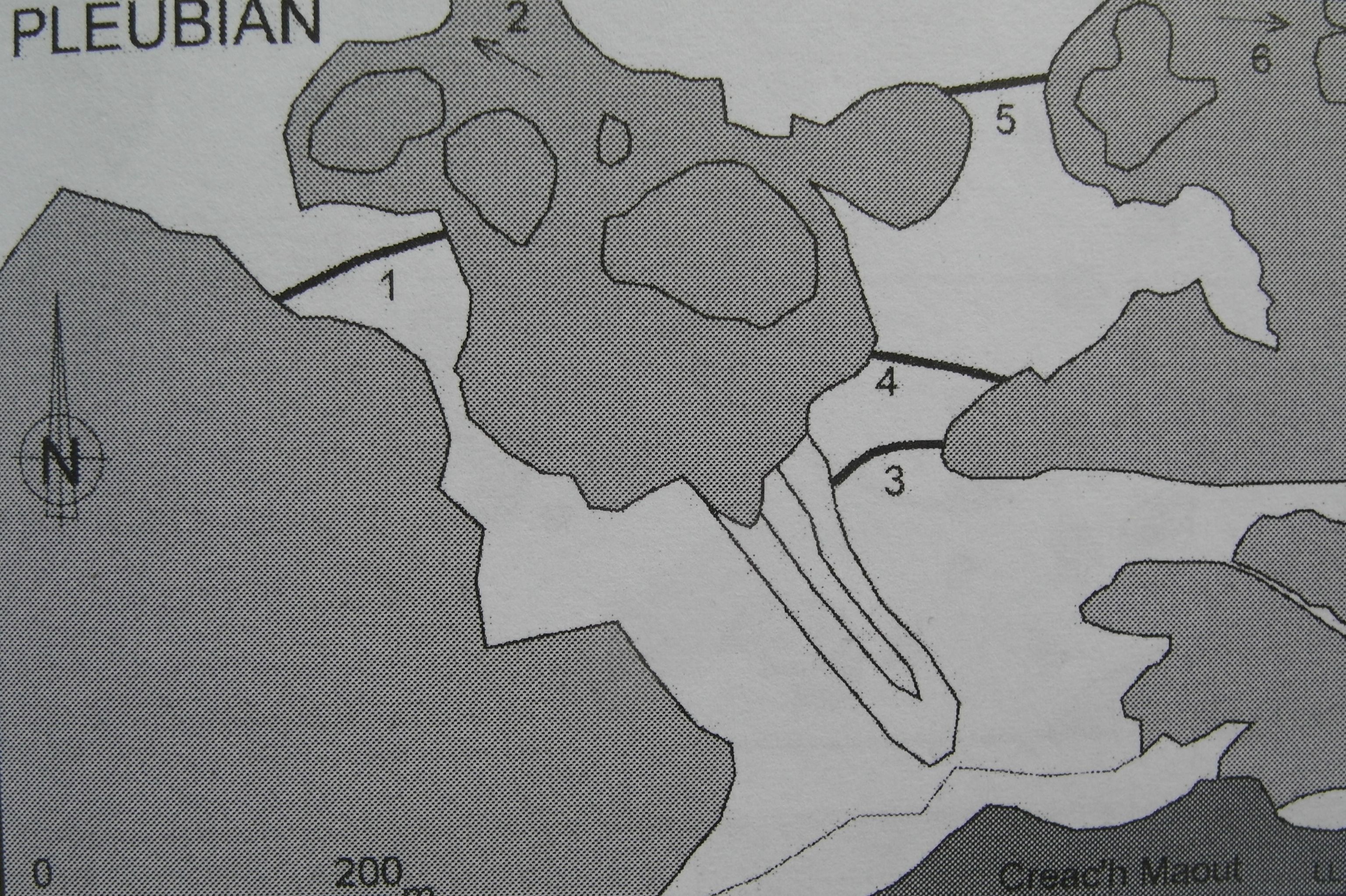 Série de 6 pêcheries du type barrage en pierres entre les queues de comètes sous Creac’h Maout en Pleubian (dessin : Loïc Langouët)Immatriculation