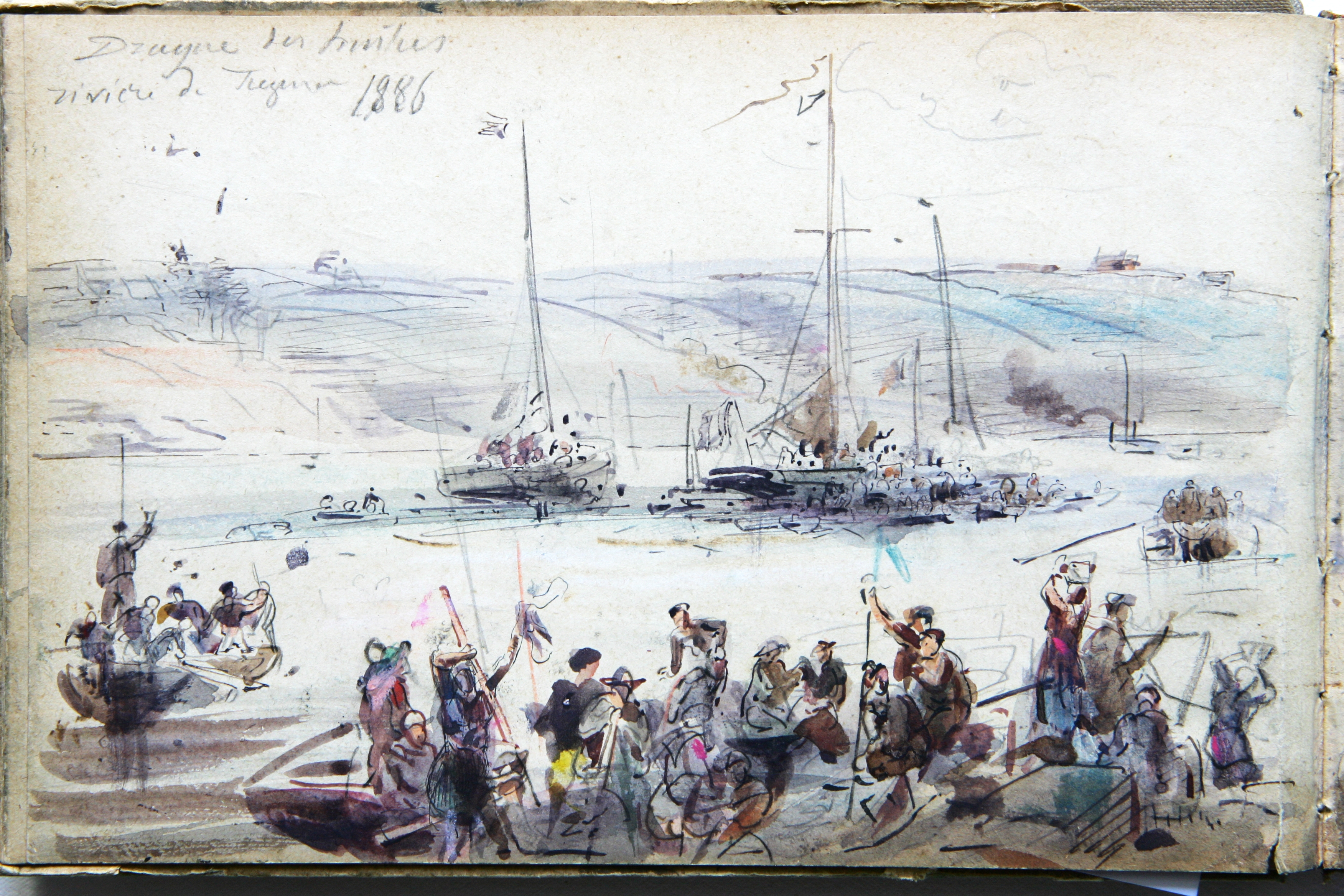 La pêche aux huîtres devant le port de Tréguier surveillée par un bateau militaire, 1886, dessin aquarellé de Faudacq (collection particulière)Immatriculation