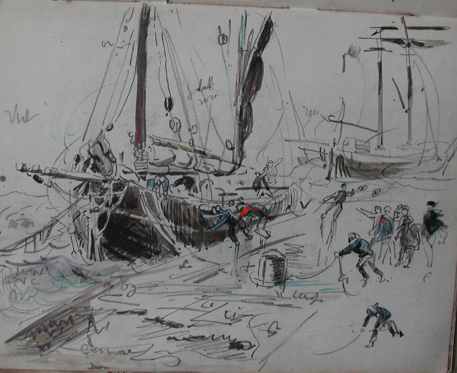 Scène de manœuvres au port de Tréguier, dessin aquarellé Faudacq, fin 19ème siècleImmatriculation
