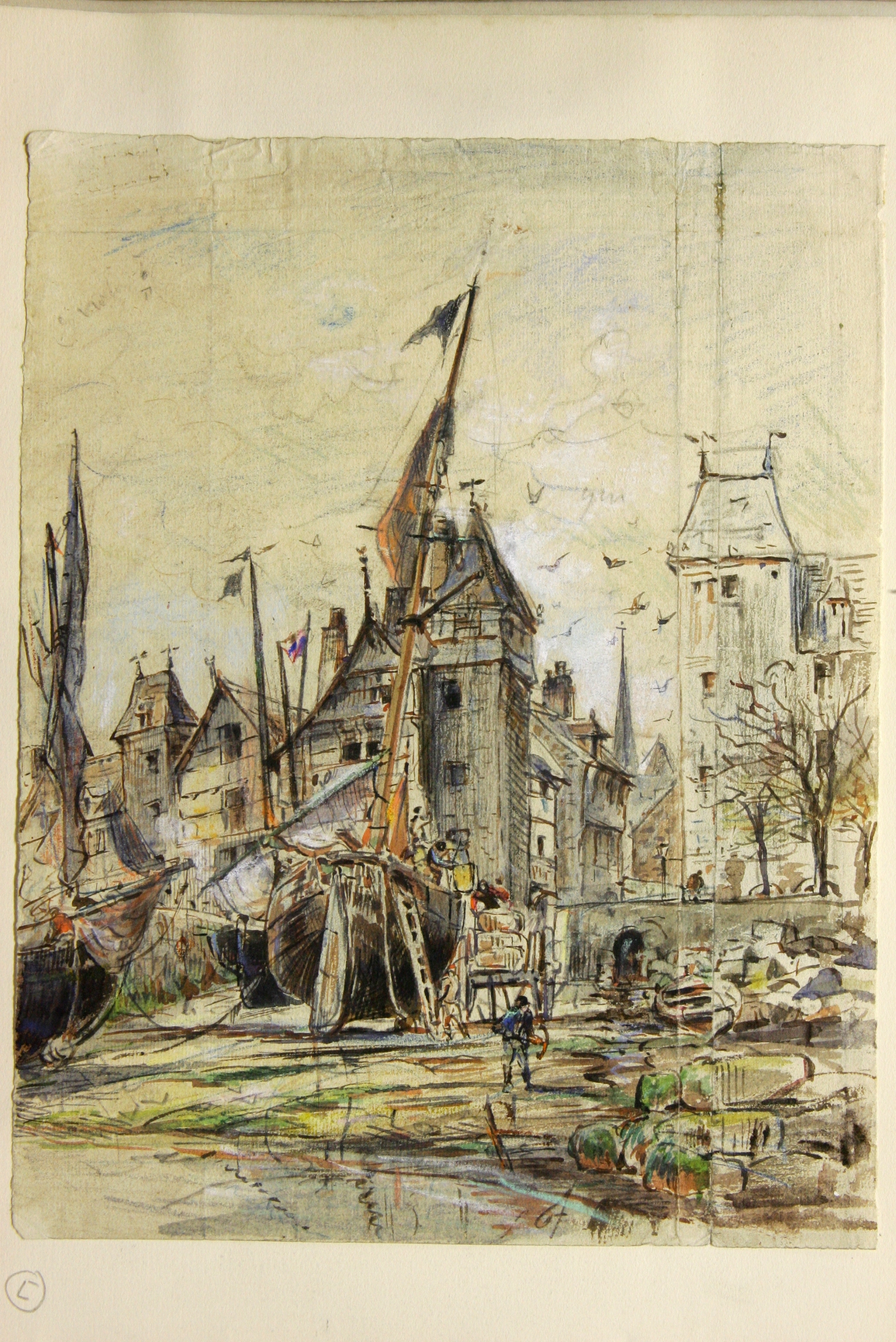 Echouage au pied de la Rue Renan sur le terre-plein du Vieux quai à Tréguier (dessin aquarellé, Faudacq)Immatriculation