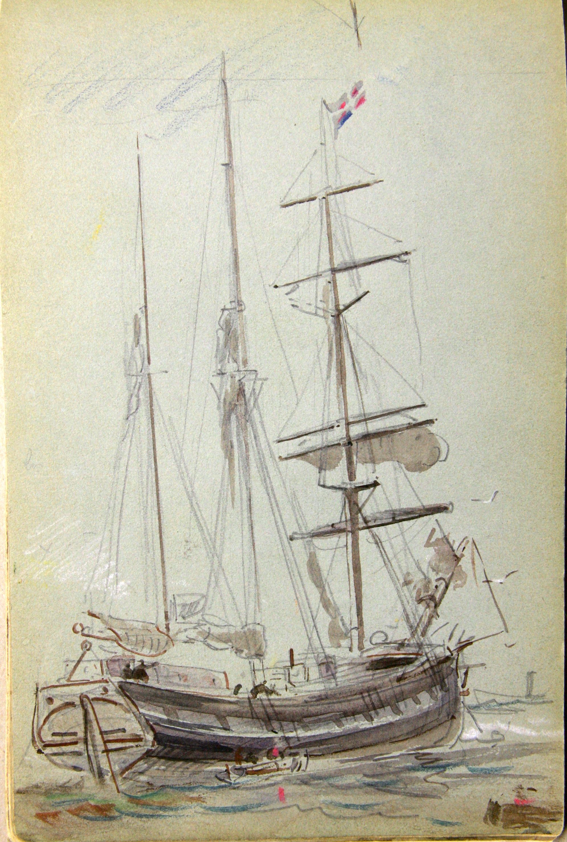 Galéasse dans la rivière de Tréguier, dessin aquarelle FaudacqImmatriculation