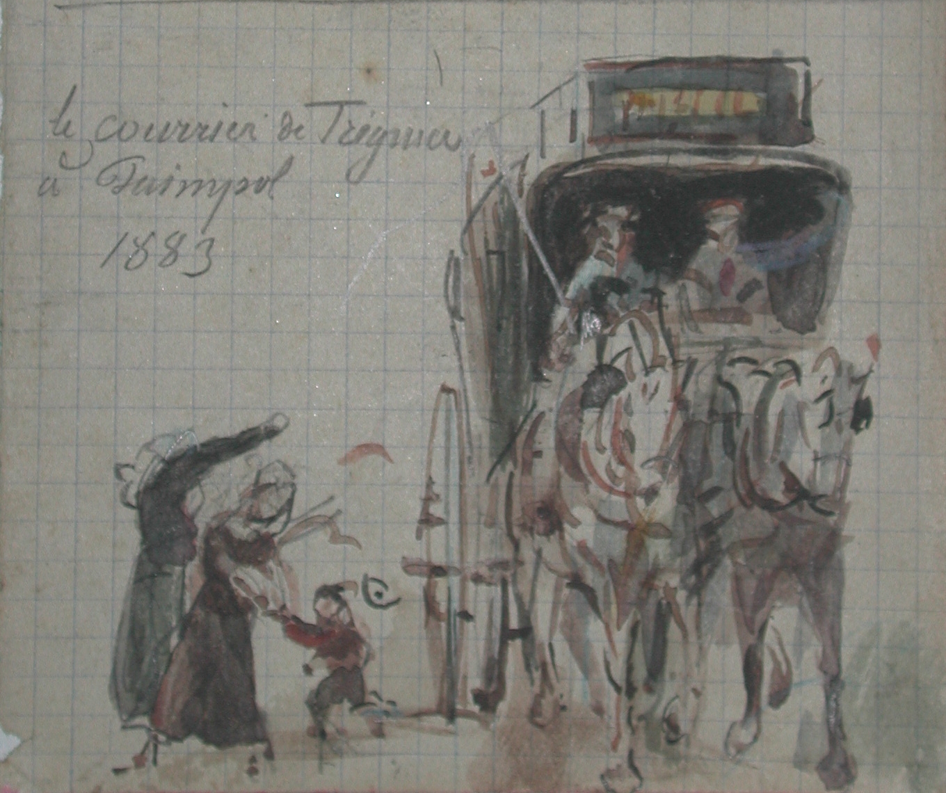 Le courrier en voiture à cheval de Paimpol à Tréguier (dessin aquarellé, Faudacq).Immatriculation