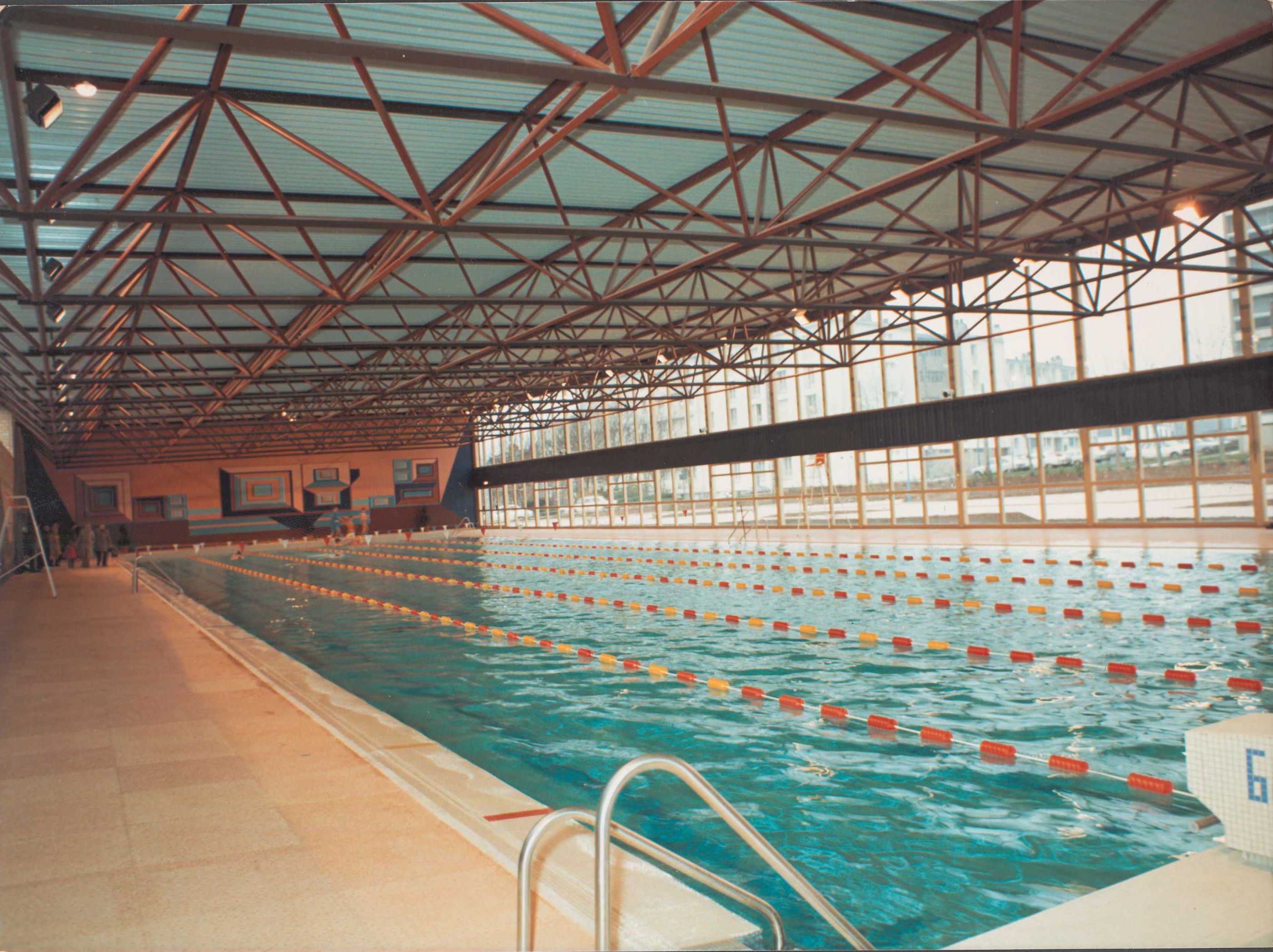 AC Brest : 2 Fi 910. Piscine municipale de Recouvrance. Grand bassin : vue des couloirs. Y. Milbéo, 1980.
