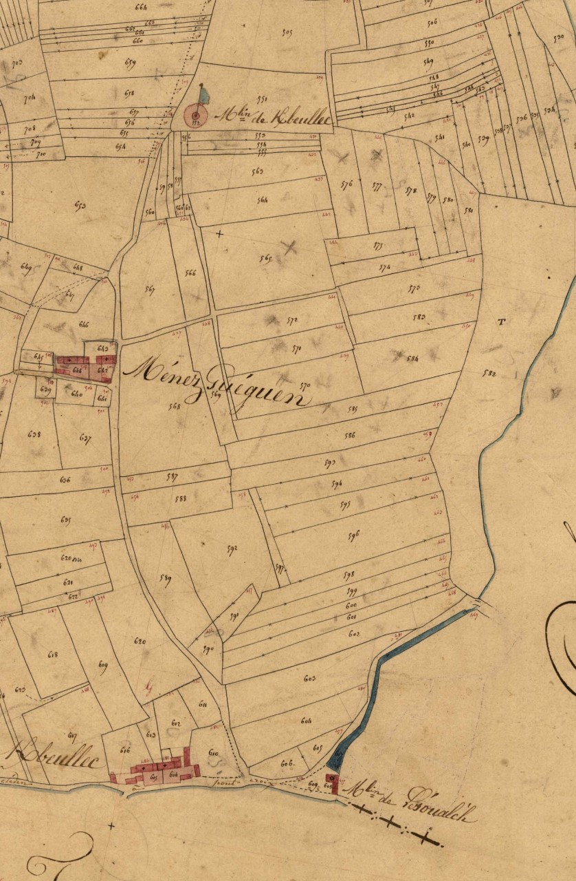 Moulins de Kerbeulec et Lezoualc'h, extrait du cadastre ancien de la commune de Goulien, 1836.Immatriculation