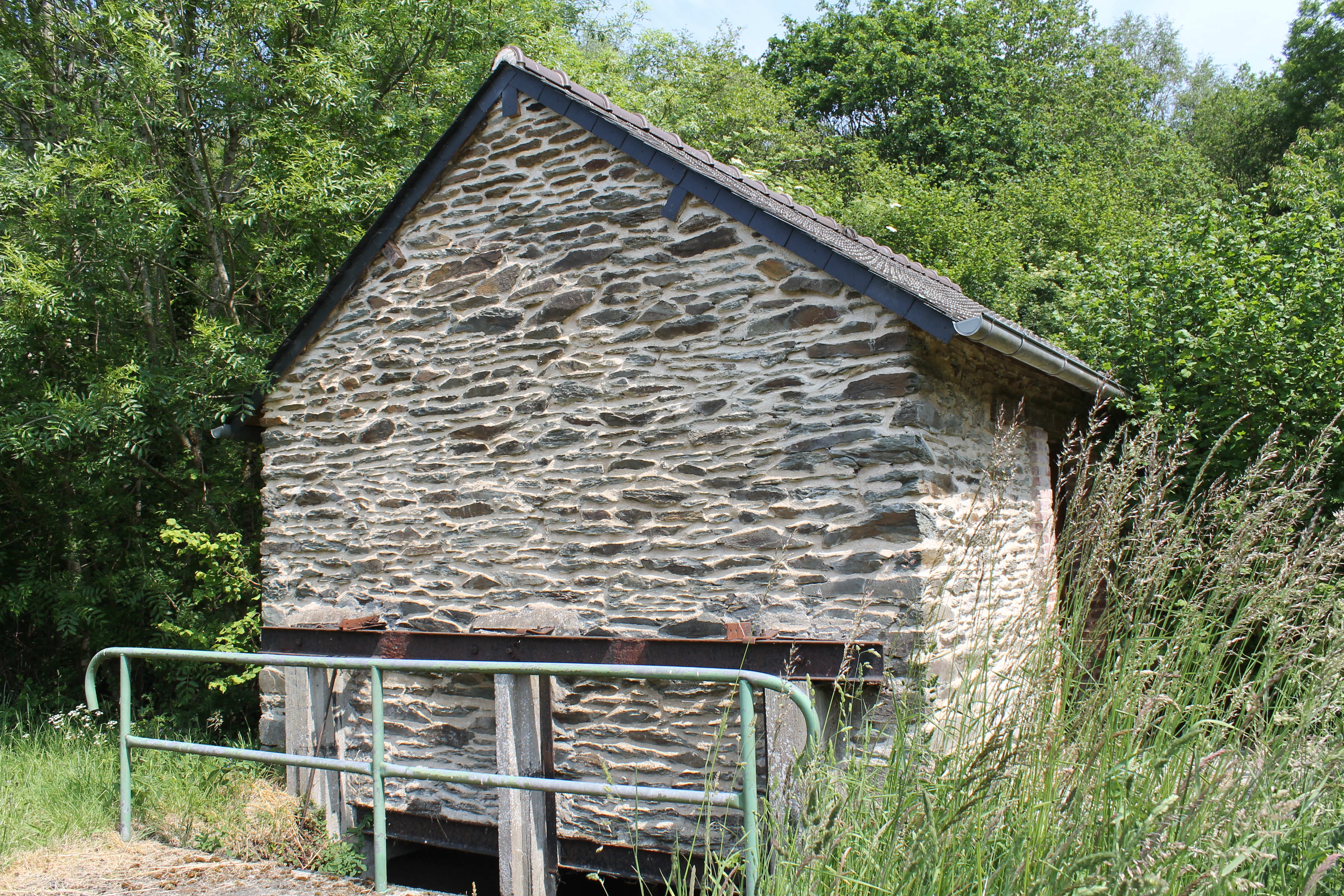 Bâtiment à turbine, Saint Hernin, vue du pignon sur la prise d'eau, située à de KergoatImmatriculation