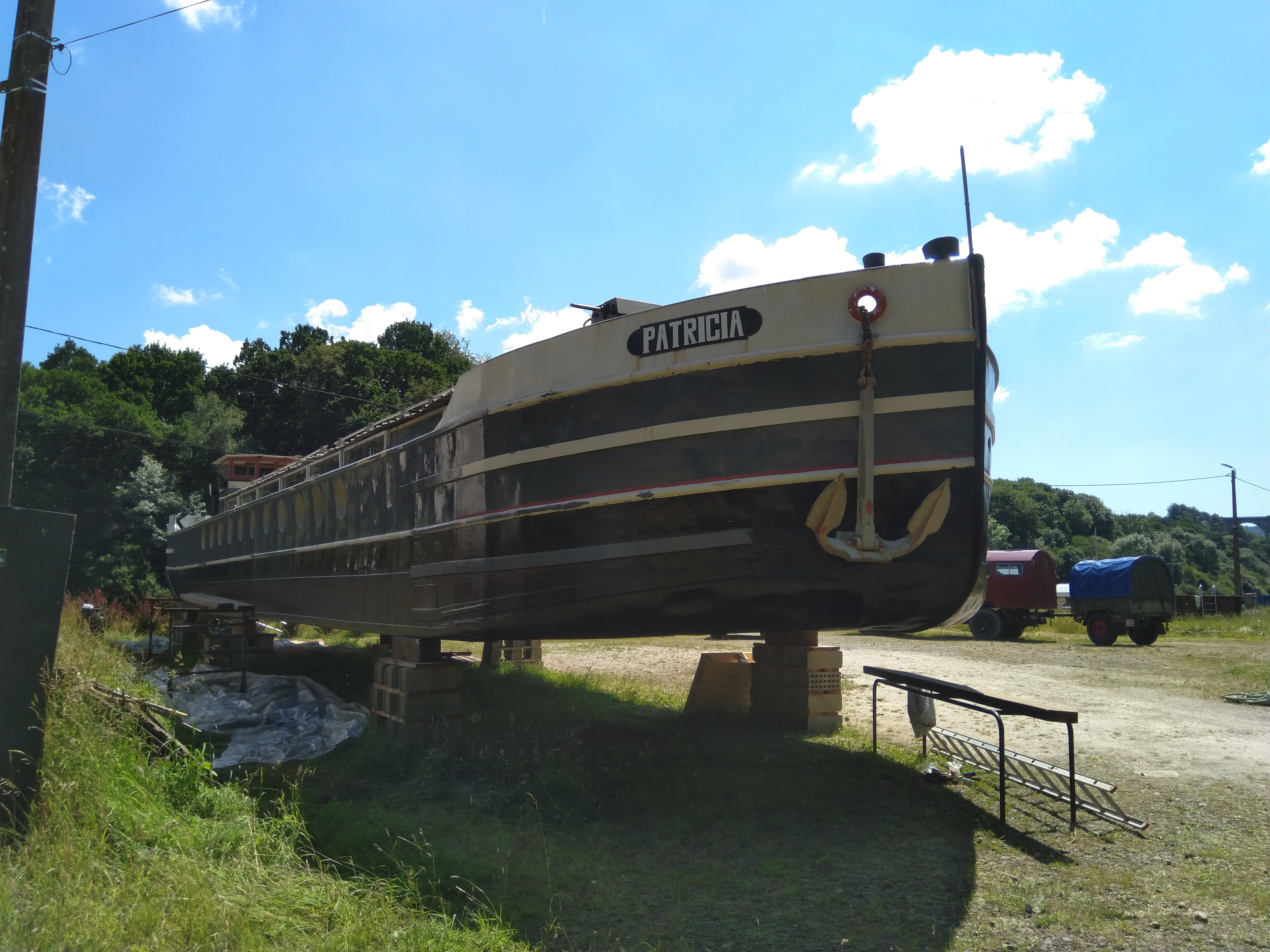 Péniche Patricia, Port-Launay, à sec sur le quai de Port-Launay, vue de l'étraveImmatriculation