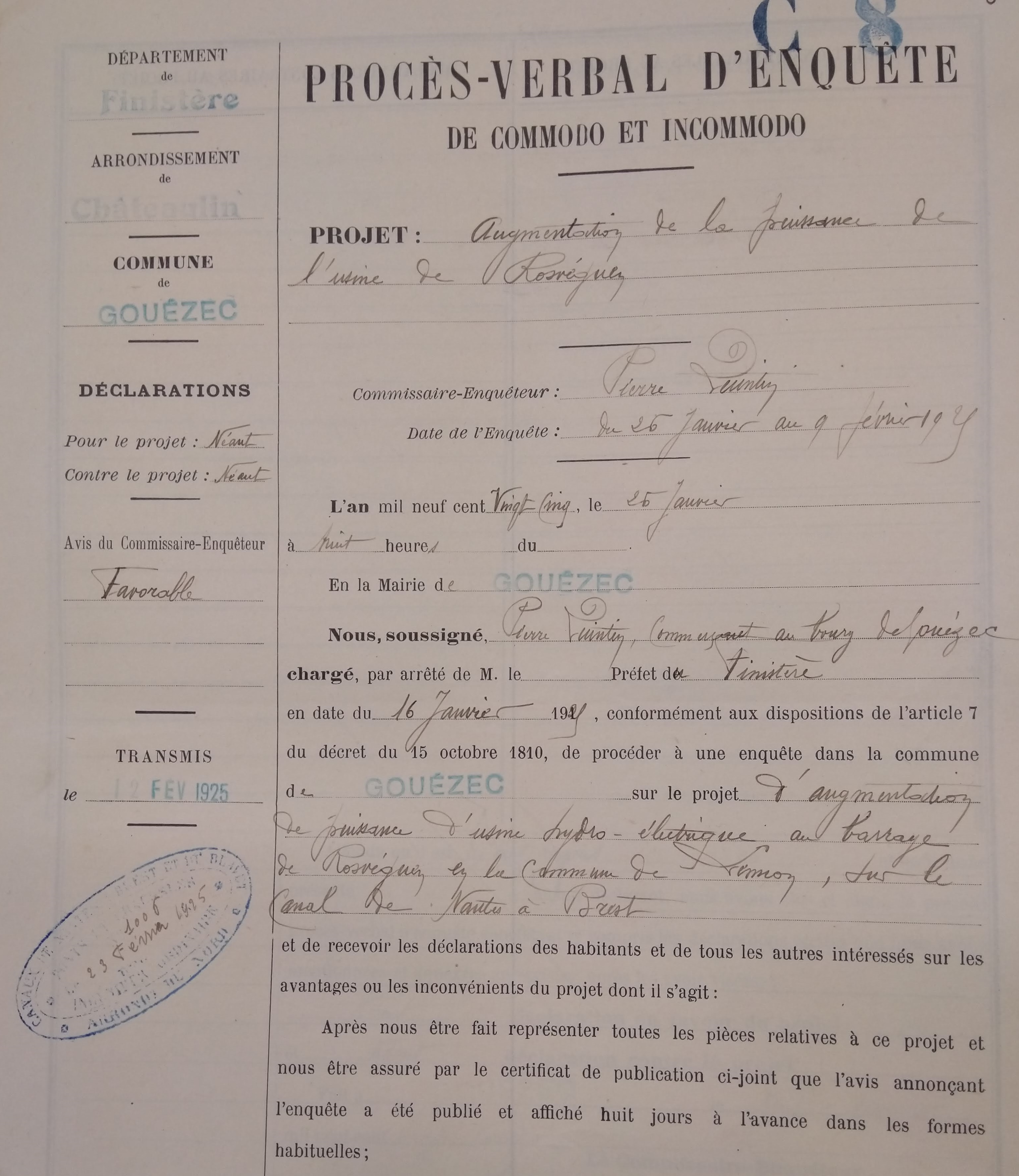Avis favorable du commisseur-enquêteur pour la demande d'augmentation de puissance de l'usine hydraulique établie au barrage n° 224 de Rosvéguen de Mme Veuve Bertheleme, 27 octobre 1924.Immatriculation