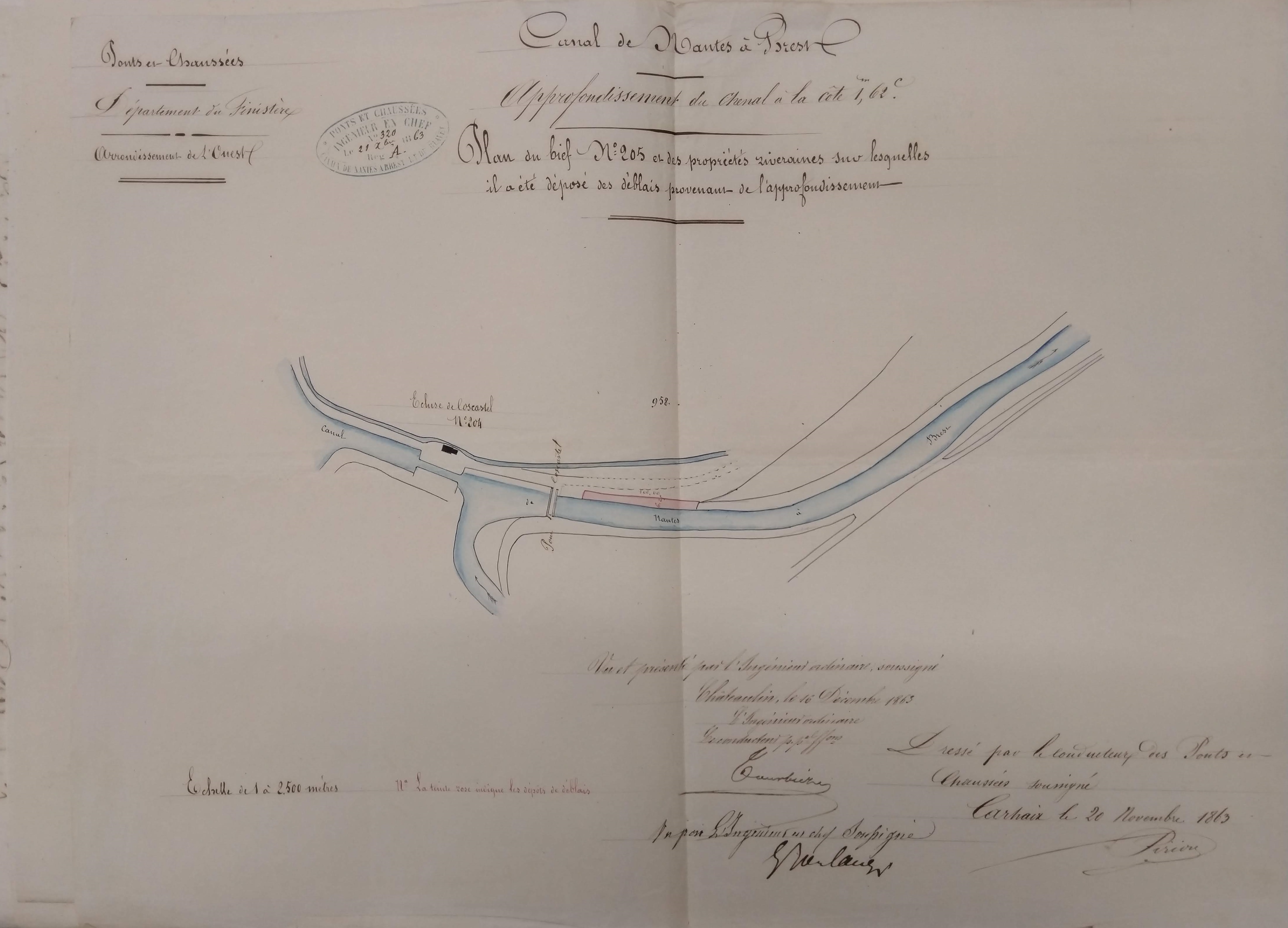 Plan du bief n° 205 et des propiétés riveraines sur lesquelles il a été déposé des déblais provenant de l'approfondissement, 20 novembre 1863. AD 3 S 17Immatriculation