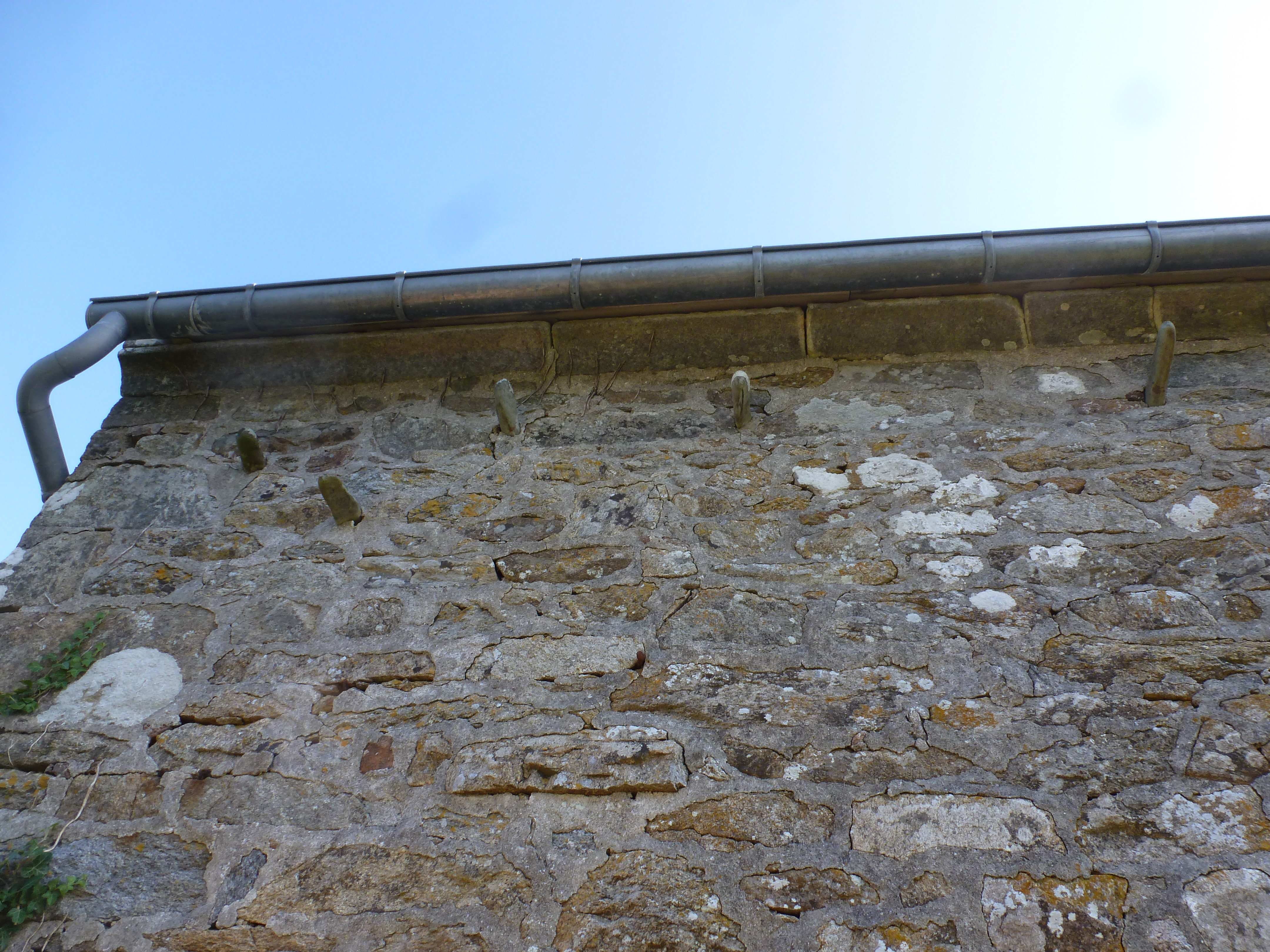 Détail de la façade sud du logis : galets saillants et corniche du toit.Immatriculation