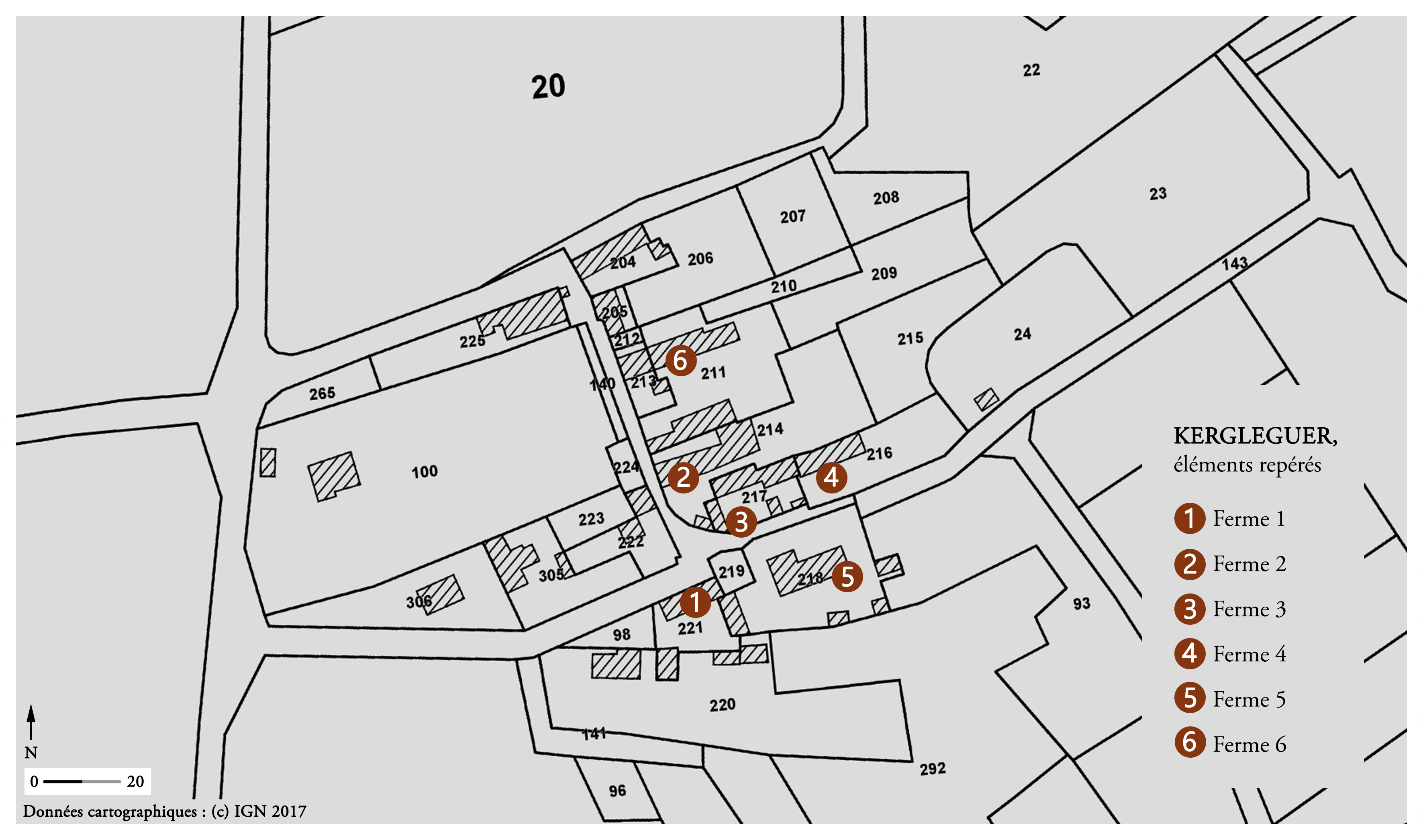 Village de Kergleguer, éléments repérés. Fond : cadastre 2017.Immatriculation