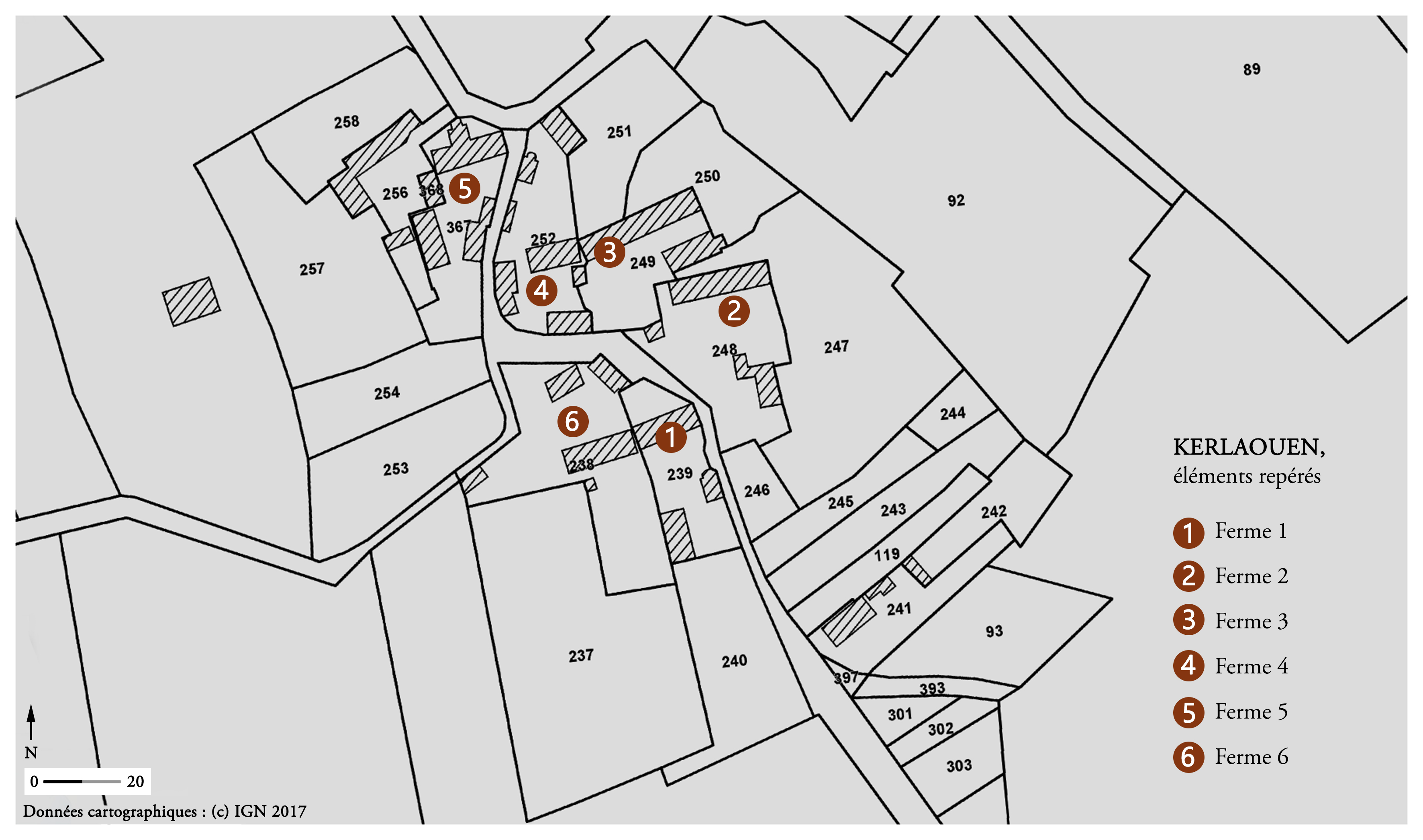 Village de Kerlaouen, éléments repérés. Fond : cadastre 2017.Immatriculation