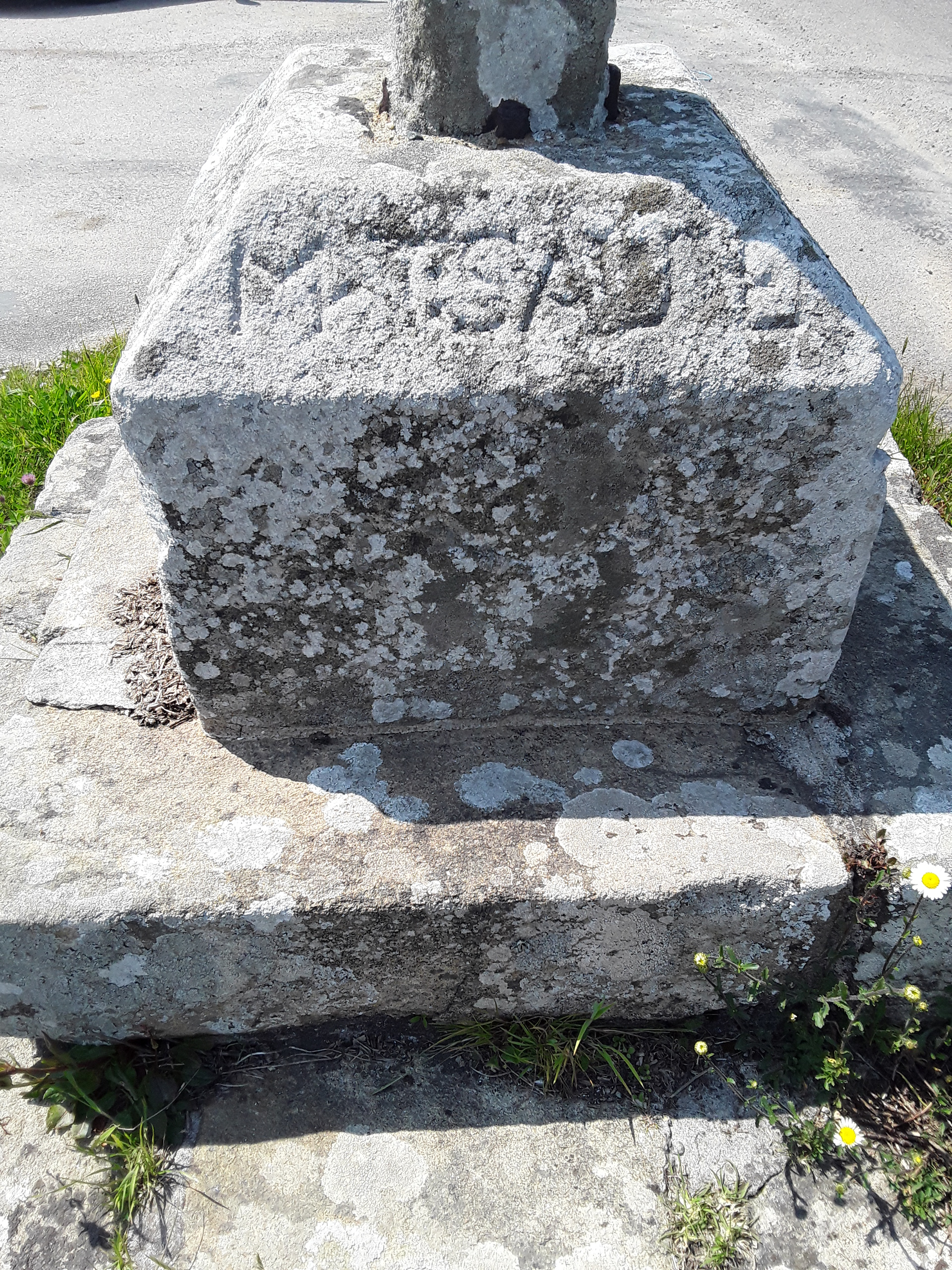 Socle côté est, détail de l'inscription sculptée sur le chanfrein "MA SAUVE PAR MIR(acle) VOEU DE JAC CALVE". (2018)Immatriculation