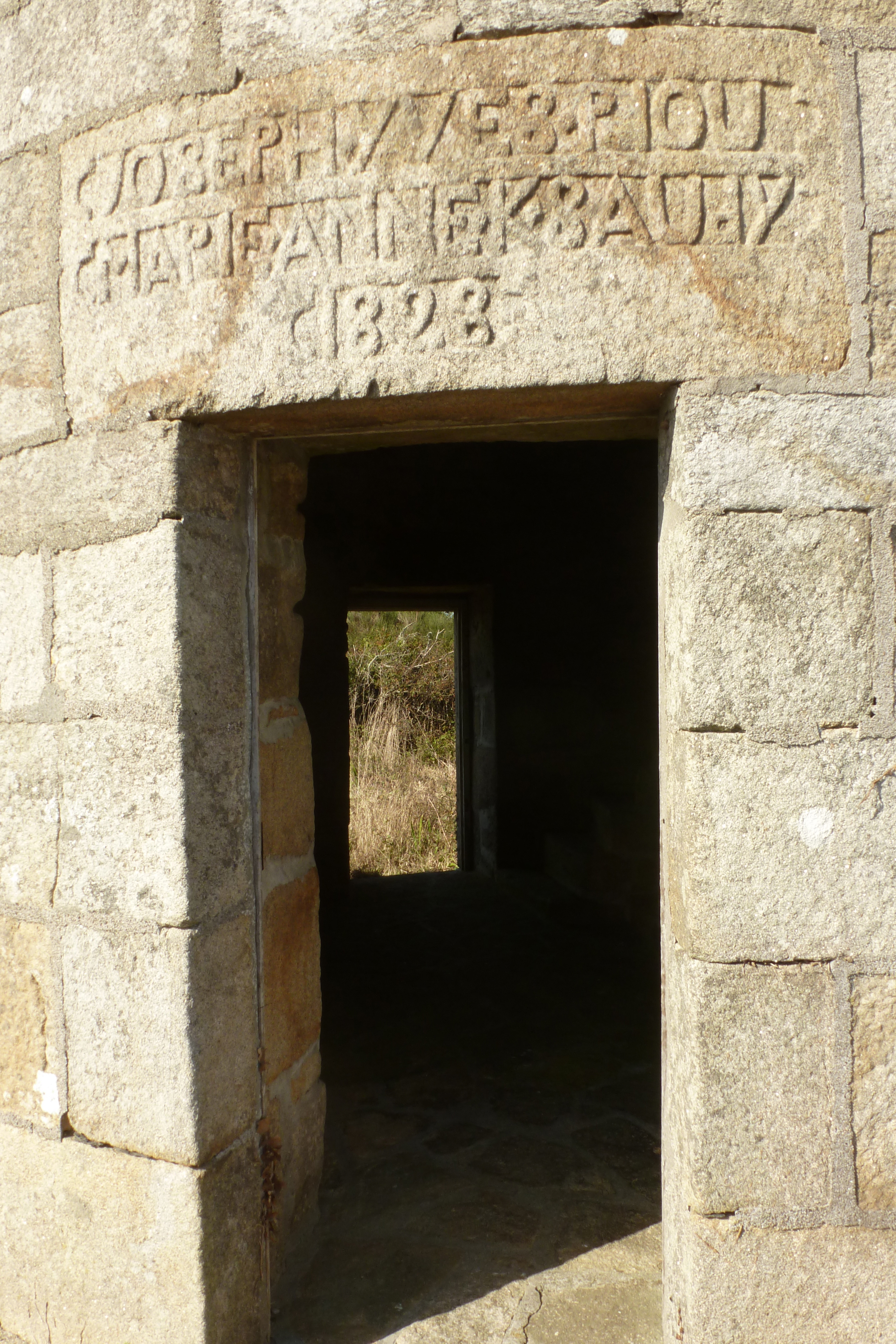 Porte sud et détail de l'inscription : " JOSEPH YVES RIOU MARIE ANNE K(er)SAUDY 1828". (2018)Immatriculation