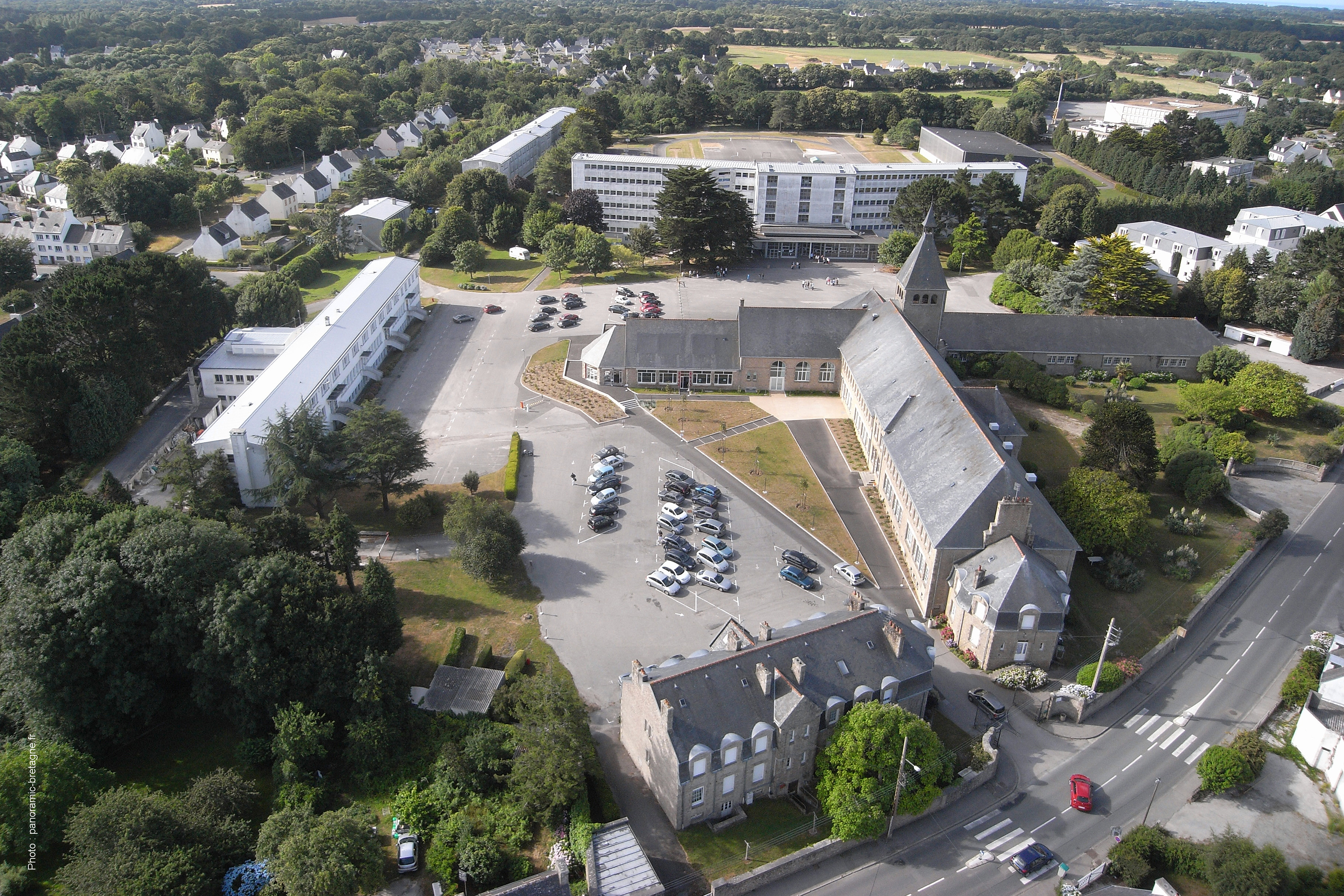 Vue aérienne d'ensemble, prise du nord (2010). Au premier plan, les bâtiments de l'ancienne école primaire supérieure. A centre, l'infirmerie (agrandie en 1953) ; à droite, avec un plan en T, le reste de l'ensemble scolaire.Immatriculation