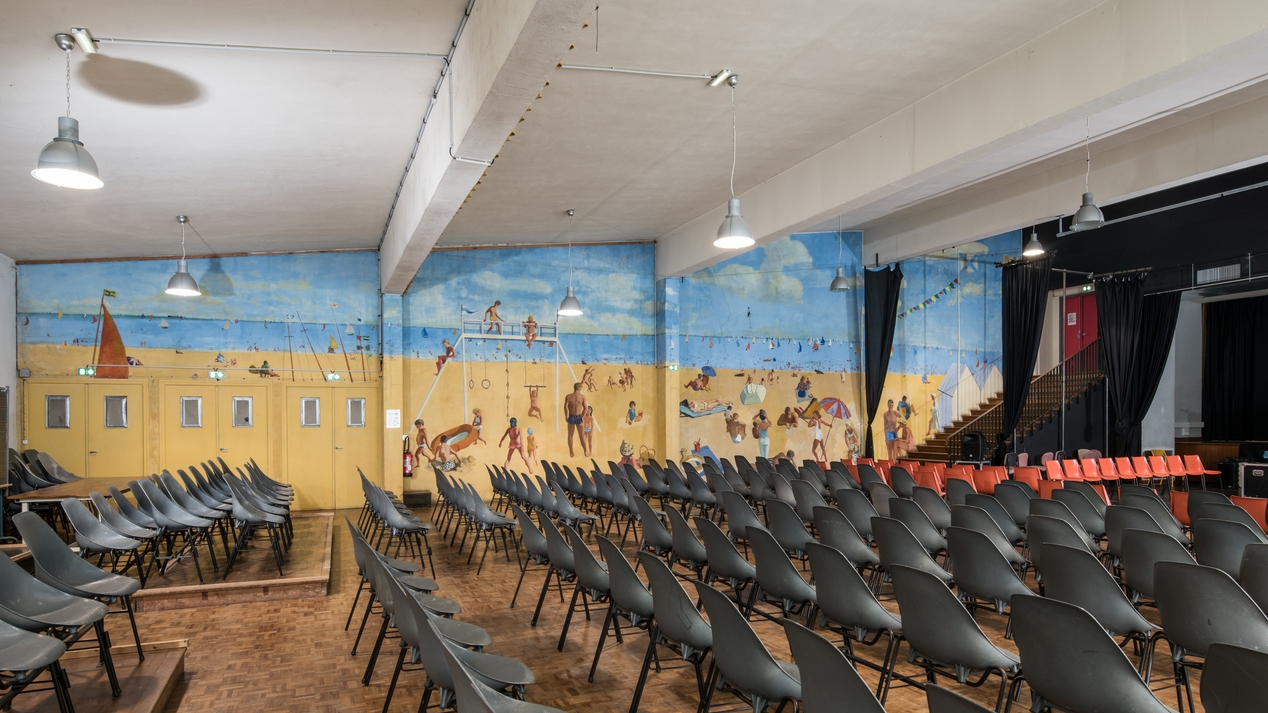 Peinture murale dans la salle des fêtes, représentant une scène de plage. Edmond Heuzé, 1963.Immatriculation