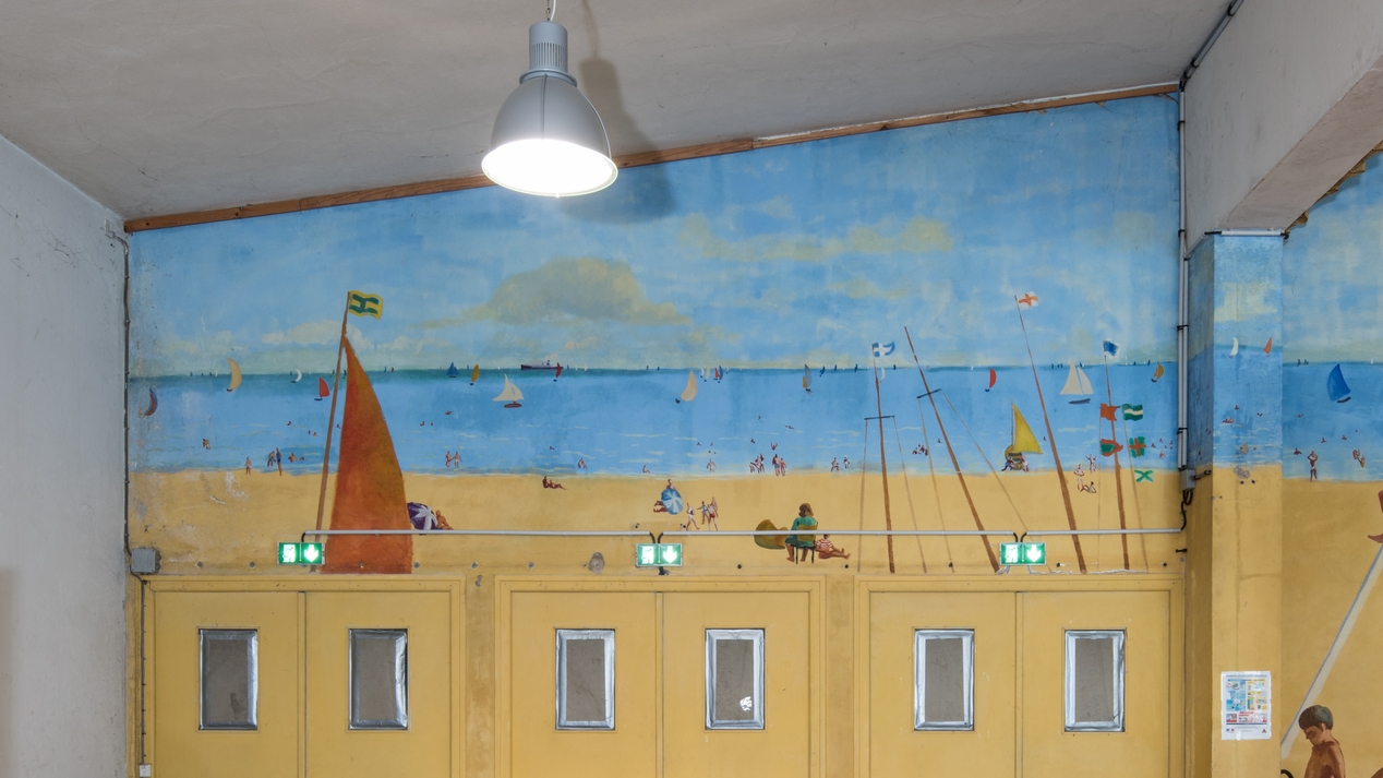 Détail de la peinture murale dans la salle des fêtes, représentant une scène de plage. Edmond Heuzé, 1963.Immatriculation
