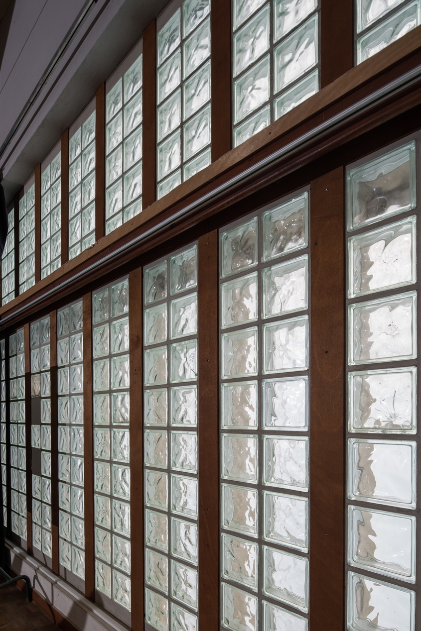 Verrière de la salle des fêtes en pavés de verre.Immatriculation