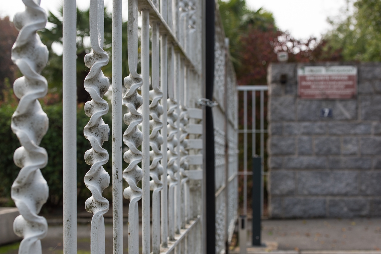 Détail du portail de l'entrée principale (ouest). Ferronnerie d'art, Raymond Subes, 1968.Immatriculation