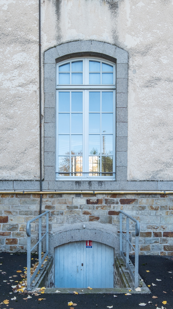 Bâtiment A, logements, détail sur une travée de la façade nord : fenêtre du rez-de-chaussée et porte de cave.Immatriculation