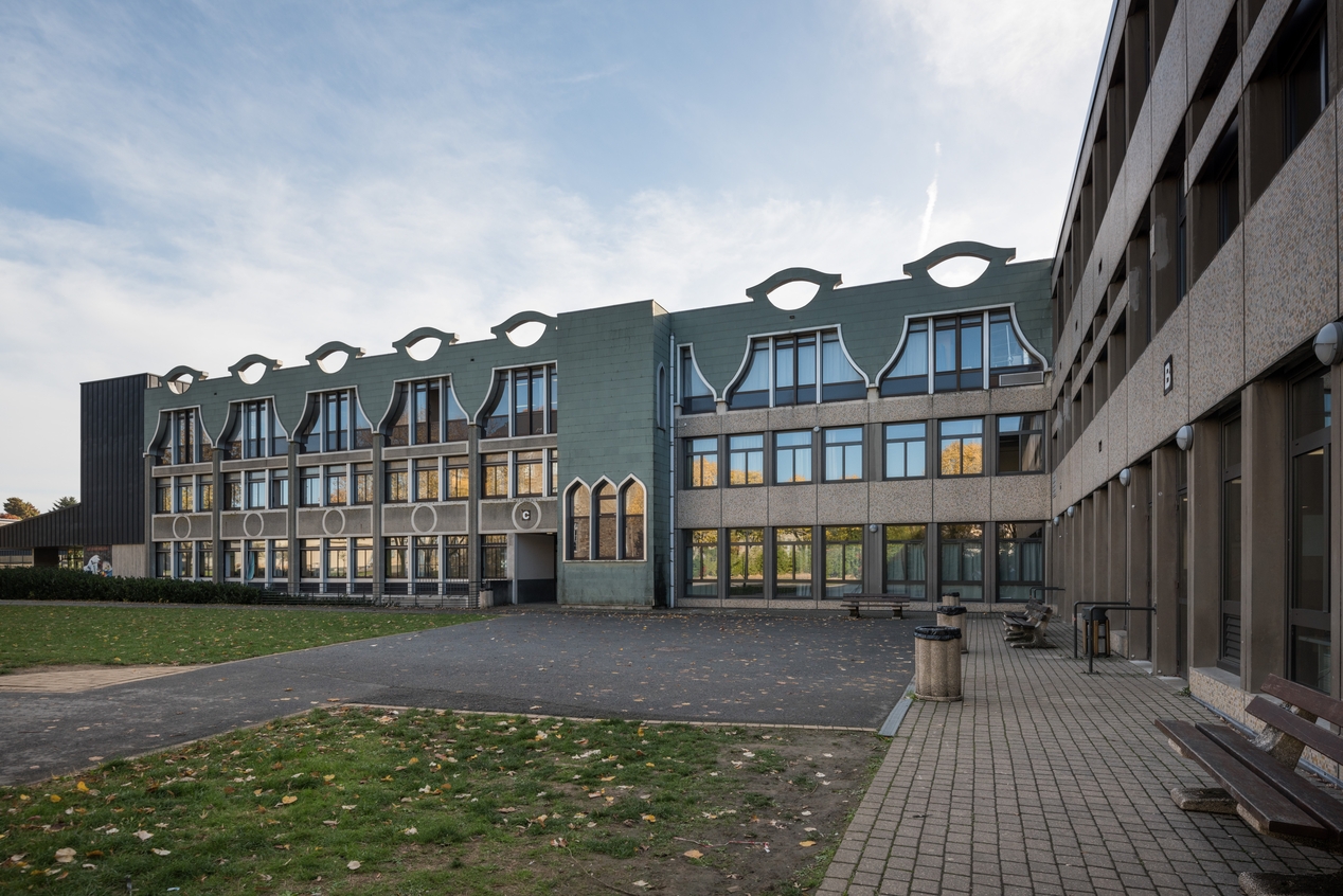 Les externats (bâtiment C à gauche ; B au premier plan) : façades sur la cour (Yves Moignet, architecte, 1975 pour le B, 1986 pour le C).Immatriculation