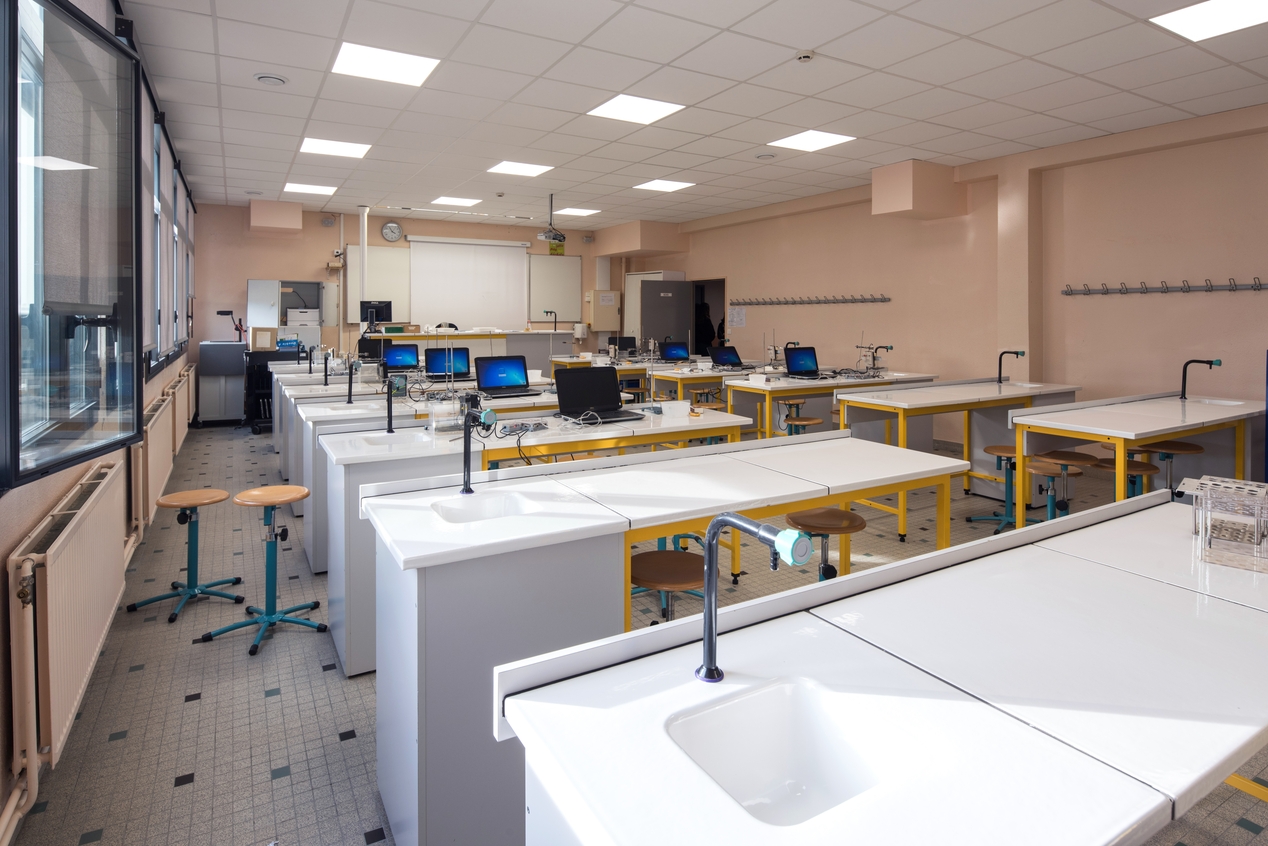 Une salle de sciences et son mobilier (ca. 1970).Immatriculation