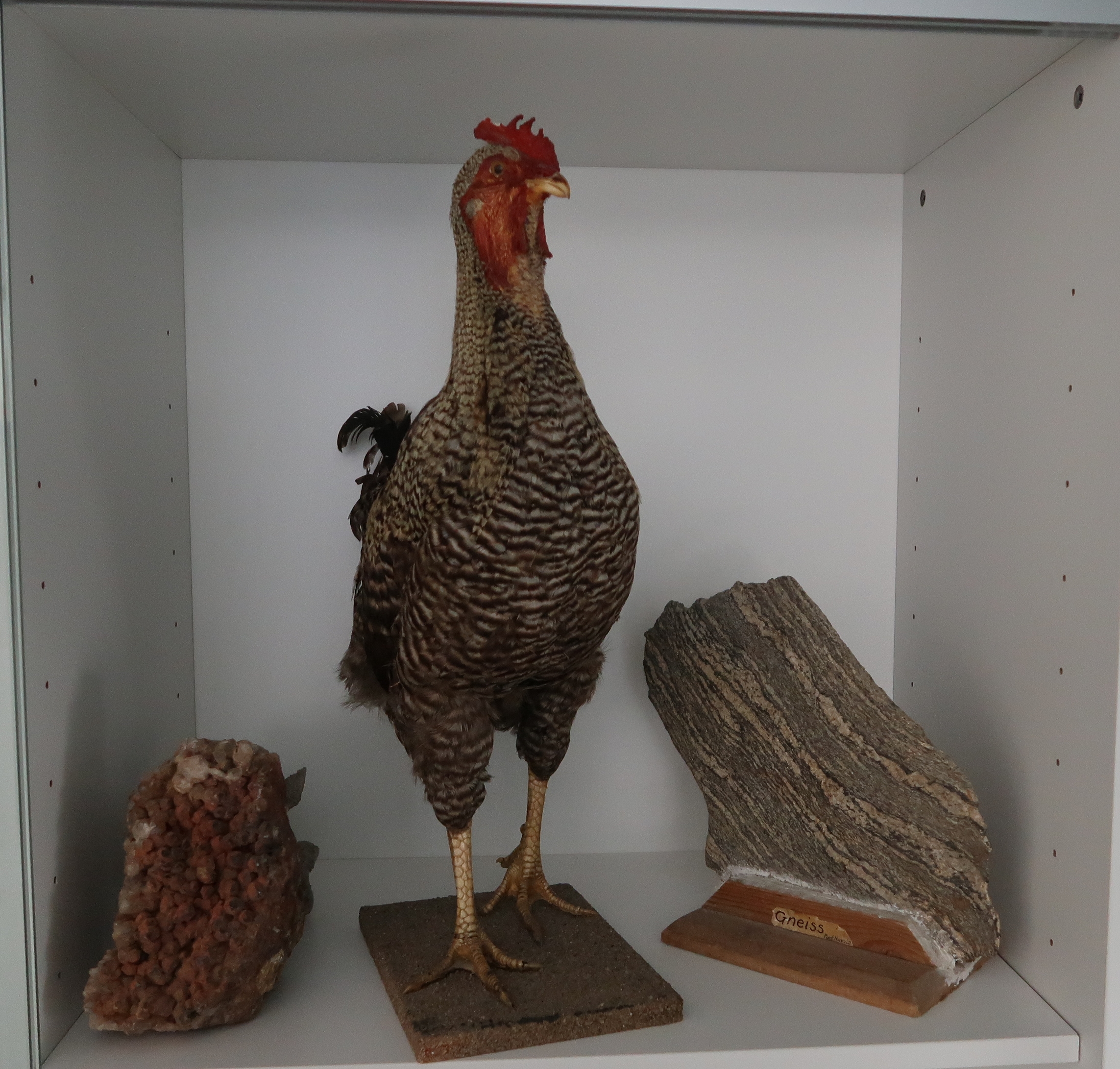 Élément des collections de zoologie : une poule Coucou de Rennes naturalisée.Immatriculation