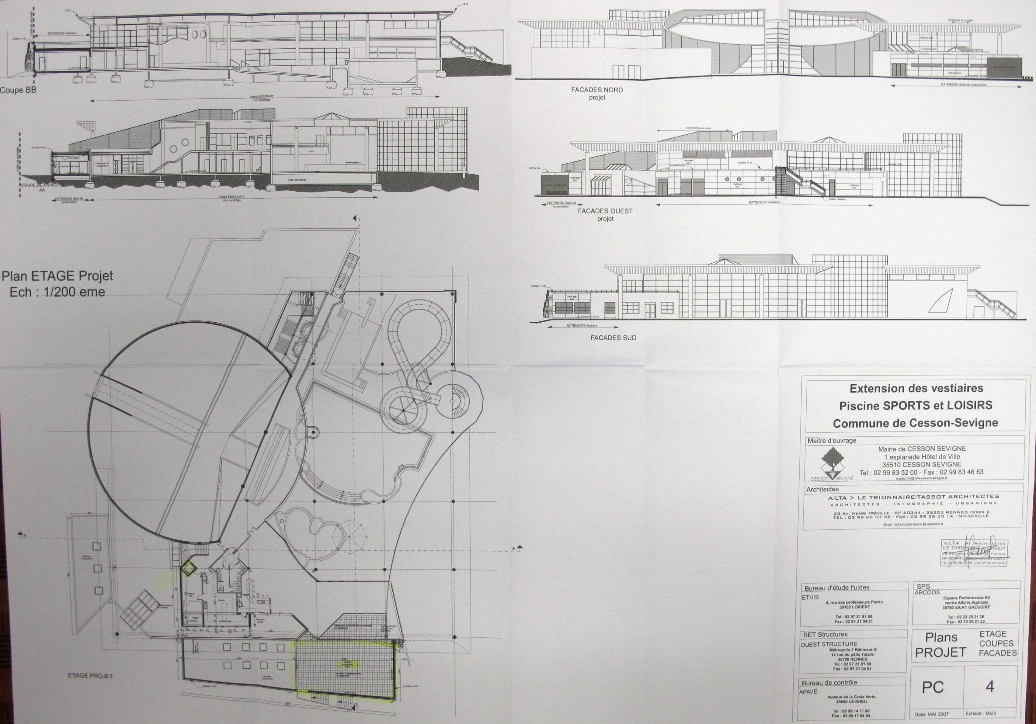 AC Cesson-Sévigné : PC n° 03505107A1031. Plans projet : étage, coupes, façades. A. Tassot & J.-L. Le Trionnaire, 2007.