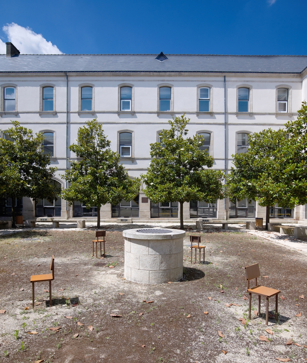 Dans la cour Emile Masson : "Perception Model III", une installation en métal et céramique, réalisée dans le cadre d'une résidence d'artiste, entre septembre 2017 et mars 2018, par les Montaincutters.Immatriculation