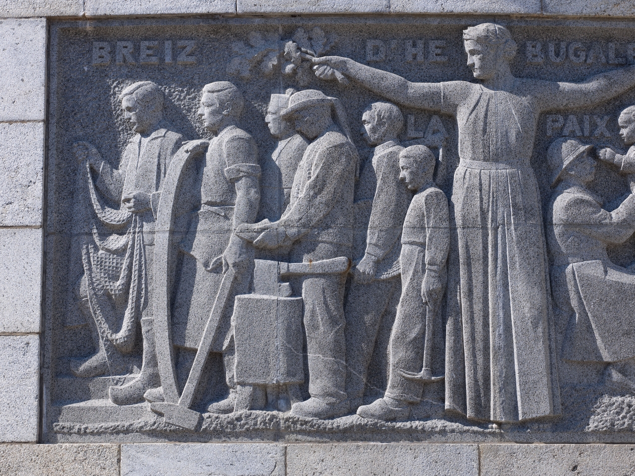 Bas-reliefs réalisés par le sculpteur Jules-Charles Le Bozec de Mellionnec (vue rapprochée).Immatriculation