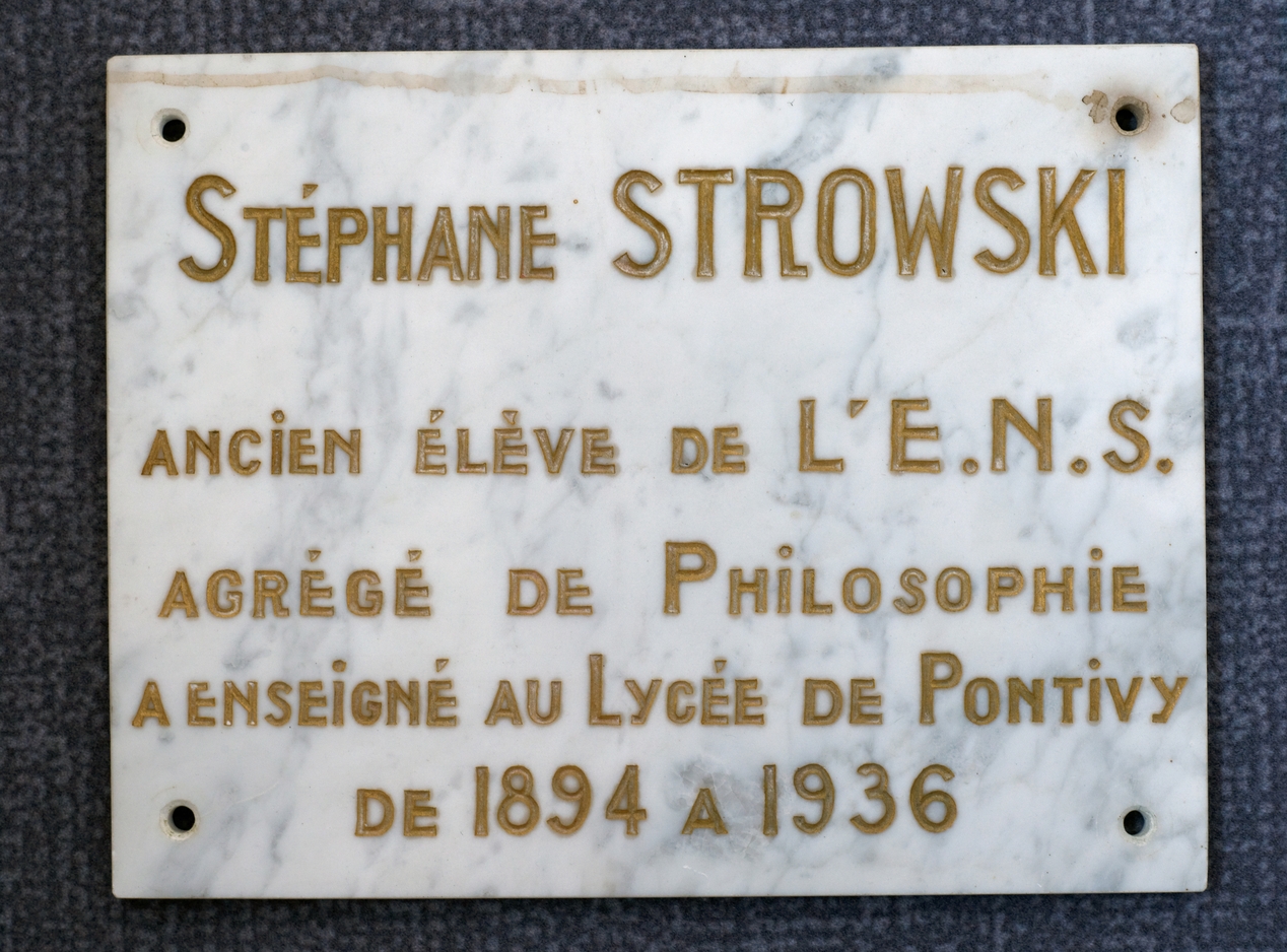 Plaque à la mémoire du philosophe Stéphane Strowski, financée par la municipalité, à la demande du proviseur en décembre 1959Immatriculation