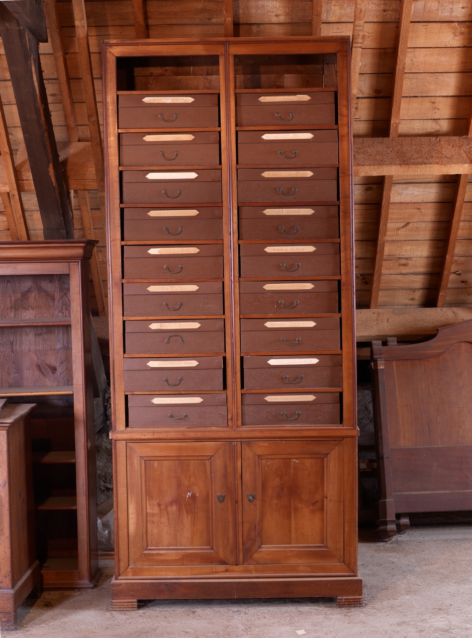 Meuble de rangement avec boites à archives en carton (quelques pièces du mobilier ancien du lycée sont conservées dans les greniers).Immatriculation