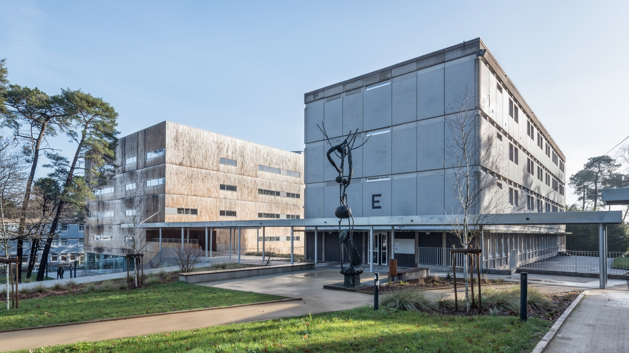 Ancien internat des filles (E) et nouvel internat, à l'arrière plan. Au premier plan la sculpture (attribuable au sculpteur Robert Couturier (1905-2008)).Immatriculation