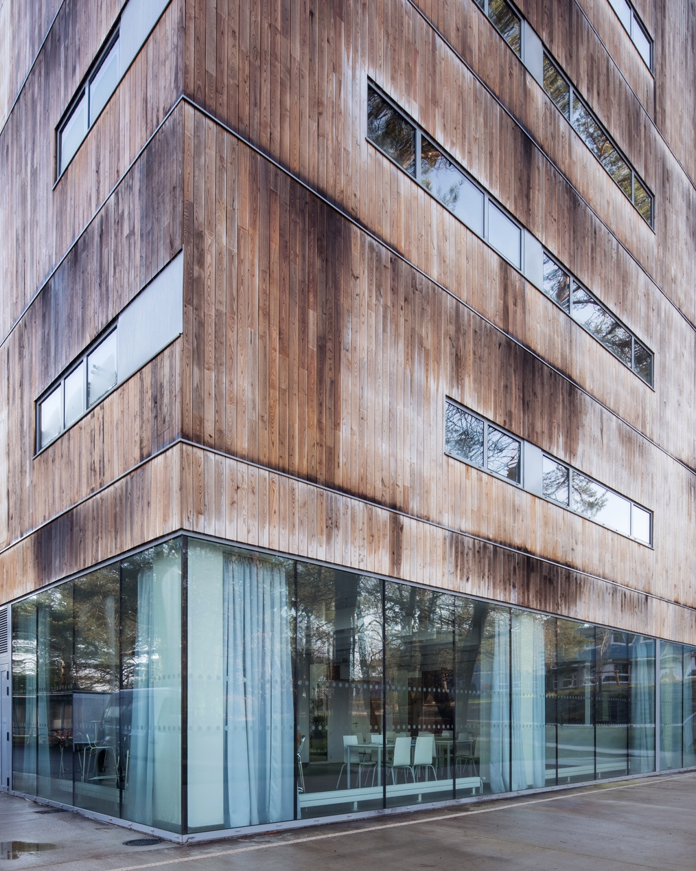 Nouvel internat (2018), David Cras, architecte. Angle nord, baies vitrées des foyers.Immatriculation