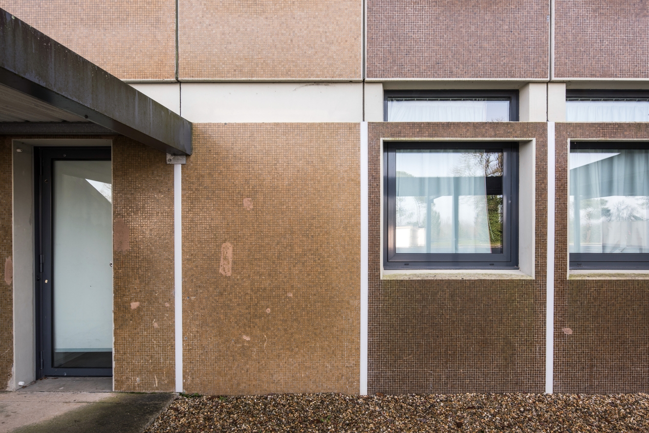 Classes des ateliers, détail de la façade nord.Immatriculation