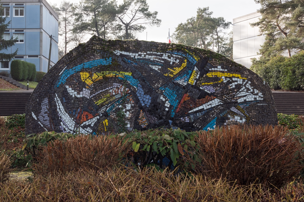 "Les Murmures de la forêt", sculpture en béton et mosaïque de Roger Lersy (1% artistique, 1975). Vue prise du nord-est.Immatriculation