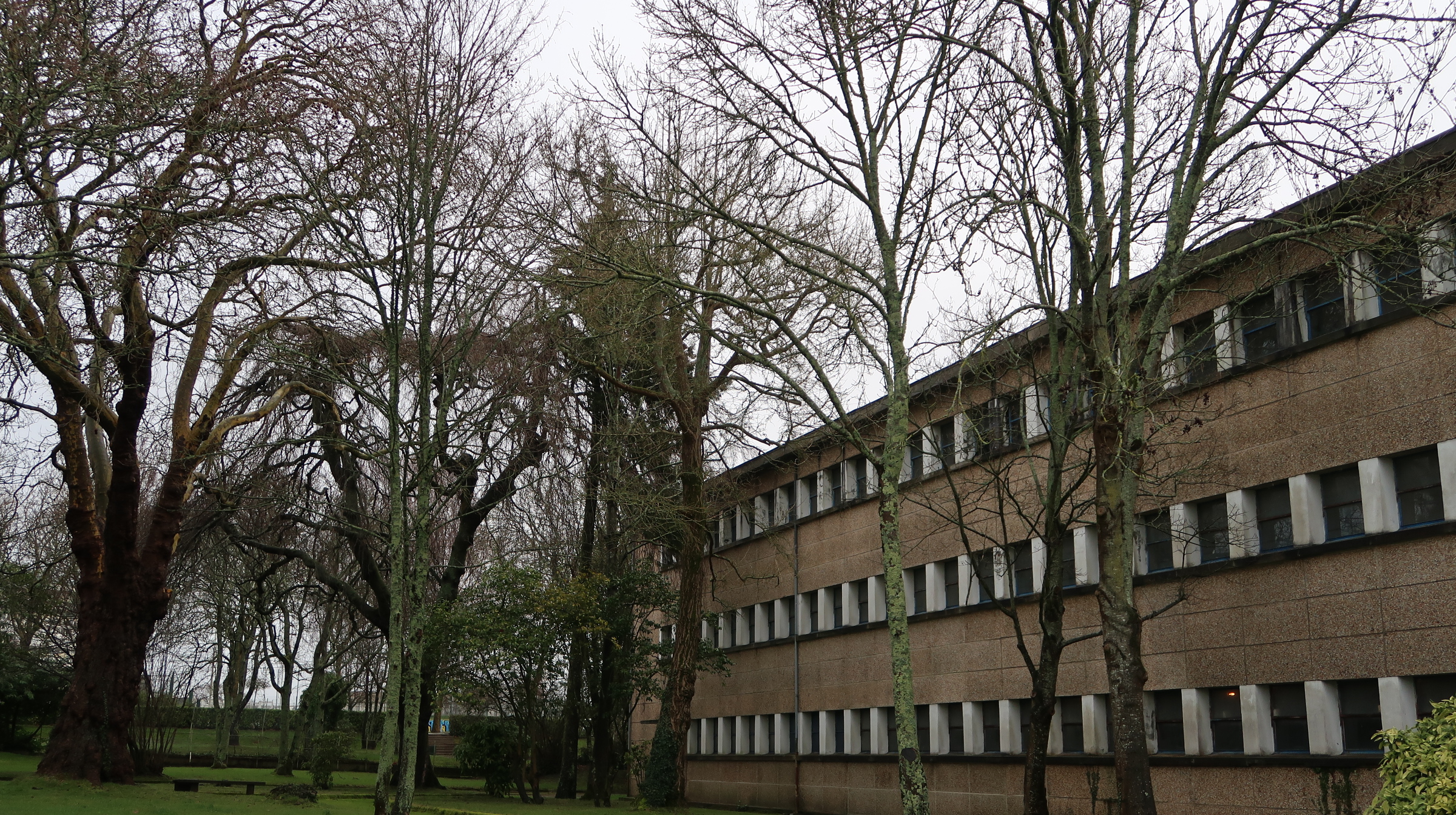 Un cadre paysager marqué par les espaces verts et la présence d'arbres de haute tige, ici, derrière un des externat dont la façade conserve ses caractéristiques d'origine (bâtiment 2)Immatriculation