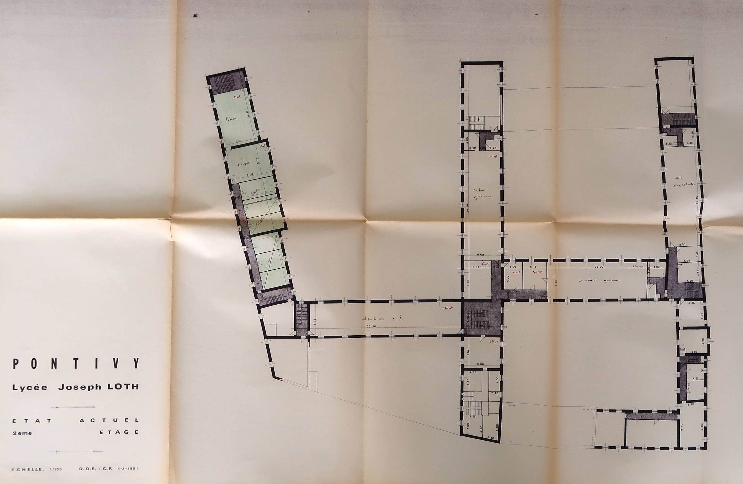 Plan du rez-de-chaussée, dressé par la DDE (Service des Construction et Équipements des Collectivités), le 4/02/1981, "les plans anciens s'averrant inexacts" (J. Berrehar, ingénieur des travaux publics de l’État). A noter : les grands dortoirs ne sont pas cloisonnés.Immatriculation
