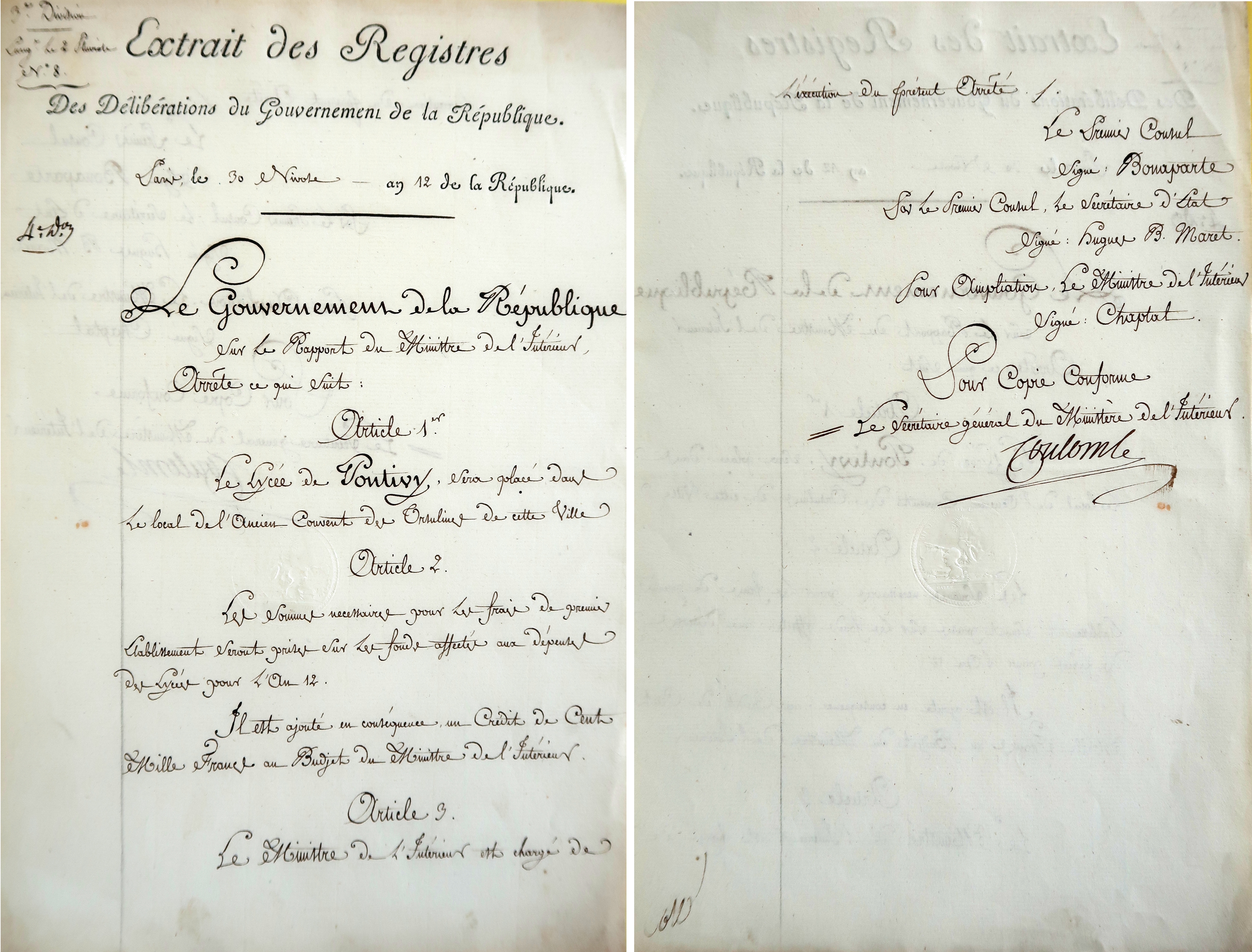 Délibération du gouvernement de la République, le 3 nivose an 12 (25/12/1803), décidant de l'implantation du lycée de Pontivy dans l'ancien couvent des Ursulines.Immatriculation