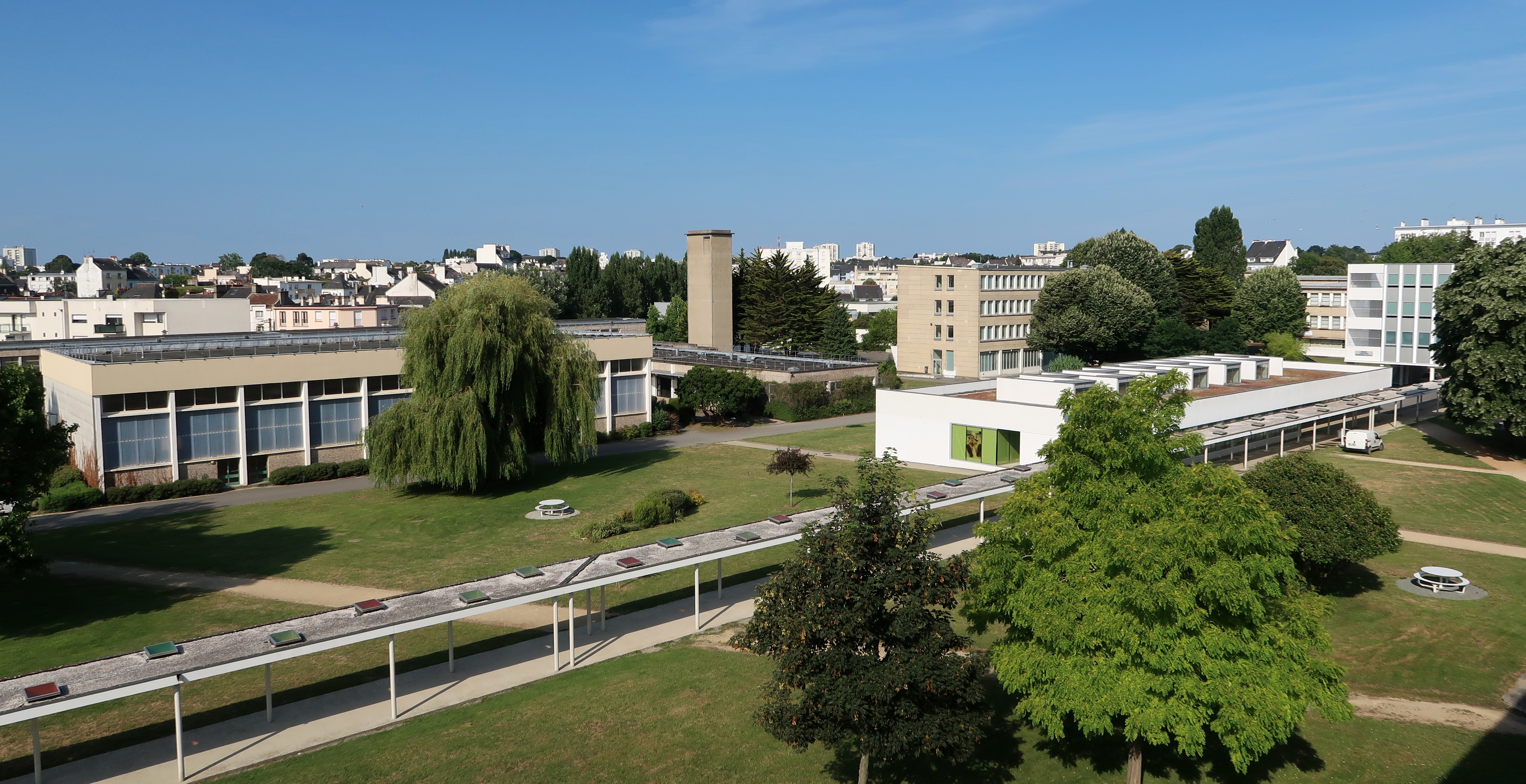 Vue d'ensemble prise du toit du bâtiment scientifique : au premier plan : galerie de circulation et CDI (P. debard et S. Bertic, architectes) ; au second plan : gymnase (R. Ouvré, architecte), cheminée du service de restauration, bâtiment des langues (ancien internat, G. Tourry, architecte)Immatriculation