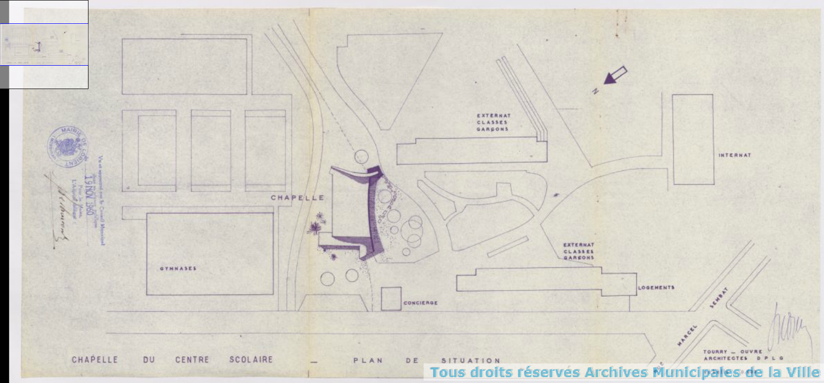 Plan du projet de chapelle pour le lycée (R. Ouvré architecte, 19.11.1960) : la chapelle réalisée est moins "ambitieuse" pour des raisons de coût.Immatriculation